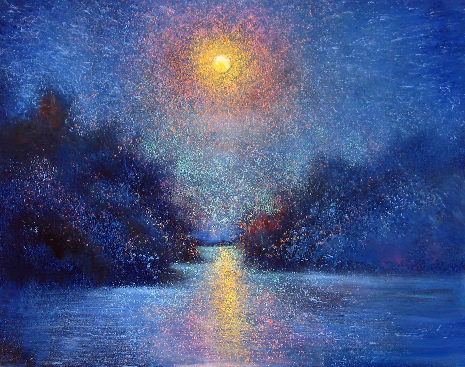 Na obrazie dominują chłodne odcienie błękitu, które tworzą wrażenie spokoju i tajemnicy. Na środku rozlewa się złote światło księżyca odbijającego się w wodzie, niczym magiczny reflektor wskazujący drogę. Kształty są miękkie, niemal rozmyte, co dodaje dziełu onirycznej atmosfery. Artysta zastosował technikę impastu, kładąc warstwy farby grubą teksturą, co daje wrażenie głębi i dynamizmu. Dzięki takiej technice obraz wydaje się niemalże żyć. Ta sceneria emanuje niewymuszonym urokiem nocy. Moim zdaniem, mogłaby opowiadać historię pełną marzeń i tajemnic. Wywołuje nostalgiczne emocje i skłania do refleksji nad pięknem natury. It's like stepping into a dream. Gdy patrzę na to dzieło, czuję spokój i jednocześnie lekką tęsknotę za chwilami kontemplacji przyrody. Patrząc na ten obraz, jest jak o chwila przerwy w czasie, gdzie wszystko trwa, ale jednocześnie się nie zmienia. Taki obraz to prawdziwa uczta dla duszy i zbłąkanych myśli. Ale fajny obraz!