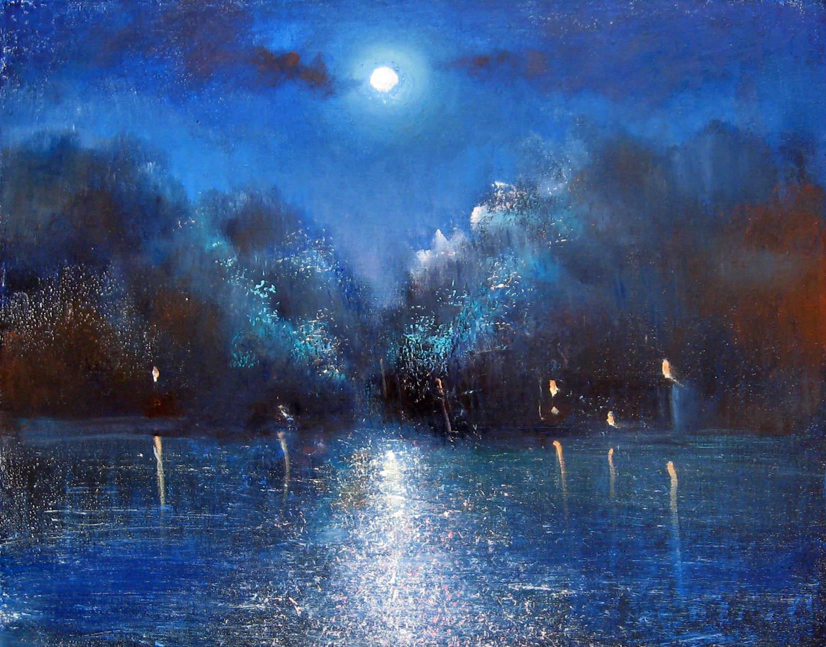 Na obrazie dominuje tajemnicza nocna sceneria pełna intensywnych odcieni niebieskiego, które mieszają się z subtelnymi brązami i szarościami. Kształty drzew i ich odbicia w wodzie tworzą magiczną kompozycję, a pełnia księżyca rozlewa srebrzystą poświatę na tafli jeziora. Całość emanuje spokojem i melancholią, jakby zapraszała do chwili zadumy nad pięknem przyrody. Styl malarski jest impresjonistyczny z nutką ekspresji, co daje efekt nieco rozmazanych krawędzi, niczym w marzeniu sennym. Ten obraz sprawia, że można poczuc ciepło nawet w chłodny wieczór. Kolory i techniki dają wrażenie ruchu, przyciągając wzrok. Dla mnie to jak cichy moment w środku hałaśliwego dnia, a ja marzę o "silent escape". Czuję jakby czas się zatrzymał, a rzeczywistość zniknęła. Ach, co za harmonia i tajemniczość! A księżyc wygląda jak piłka na niebie! Idealne na wieczorne rozmyślania, prawda? Światło, które odbija się w wodzie, przypomina delikatne iskierki. Może i Ty znajdziesz tu jakąś swoją historię.