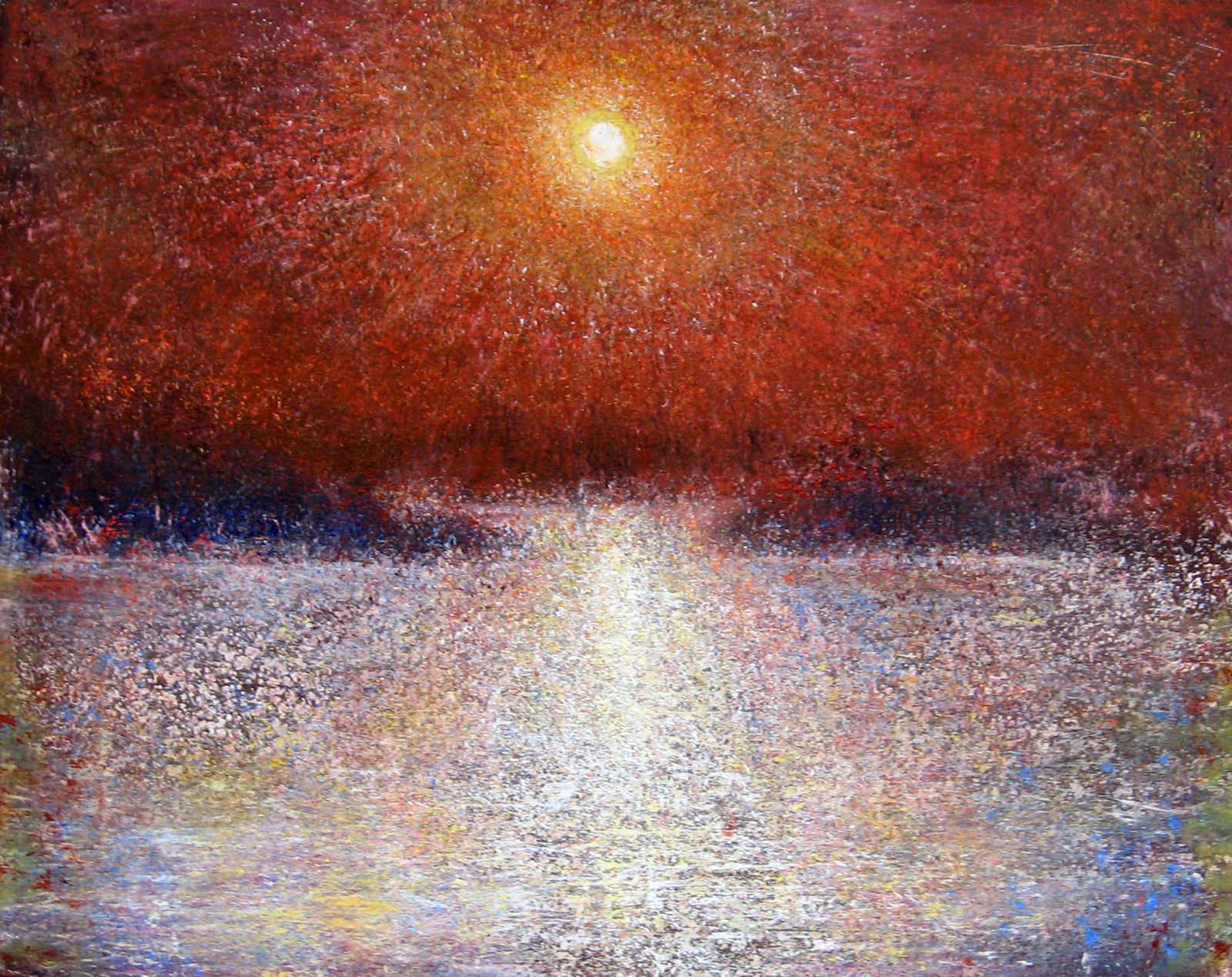 Cóż za hipnotyzujący widok. Na obrazie widzimy morze otulone ciepłym światłem zachodzącego słońca. Niebo okrywa się intensywną czerwienią, która przechodzi w ciemniejsze odcienie na horyzoncie. Centralny punkt to słońce, które jakby tańczyło, odbijając się w wodzie w tysiącu świetlnych iskier. Całość malowidła jest jakby delikatnie zamglona, nadając mu dreamlike klimat. Artysta użył impasto technique, co widać po grubych warstwach farby. Pociągnięcia pędzla są zdecydowane i dynamiczne, a kolory przenikają się, tworząc niesamowitą grę światła i cienia. Patrząc na obraz, czuję spokój, jakby czas się zatrzymał. To jak chwila złapana w magicznym, nieuchwytnym momencie. Mała dziewczynka w środku dnia mogłaby powiedzieć, że słońce bawi się w chowanego z morzem. Ta gra barw jest po prostu breathtaking. Kto by pomyślał, że czerwień może mieć tyle twarzy? Każdy patrząc na to dzieło, może zobaczyć coś innego i poczuć coś innego, ale niewątpliwie serce zadrży.