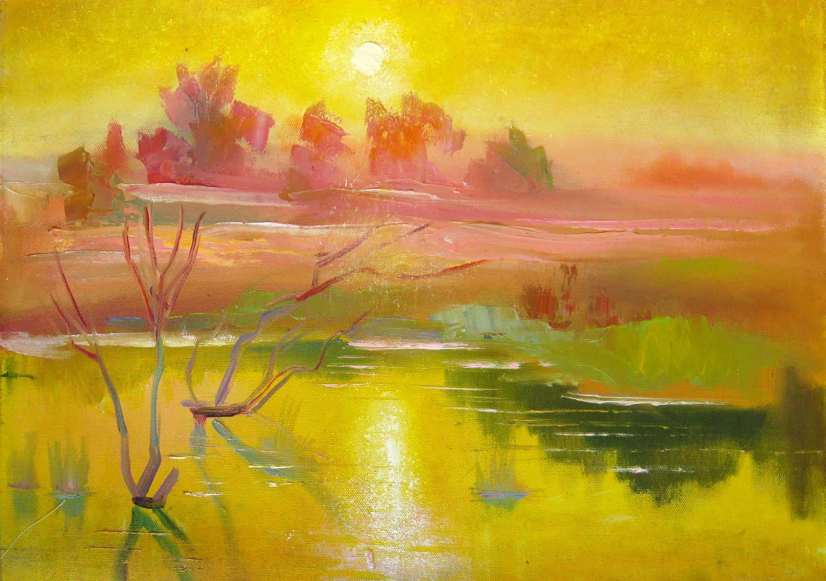 Na tym obrazie dominują ciepłe odcienie żółci i różu, które pięknie się przenikają, tworząc bajeczny krajobraz o zachodzie słońca. Drzewa, jakby namalowane pędzlem z miękkim włosiem, wyłaniają się z mgły w tle. Na pierwszym planie widzimy delikatnie falującą wodę, odbijającą świetlisty blask nieba. Kompozycja obrazu prowadzi wzrok od jasnego słońca przez ciepłe pasma kolorów, aż po grafitowe gałęzie wynurzające się z wody. Atmosfera tej pracy jest magiczna i nostalgic, jak z baśni, w której czas płynie powoli i leniwie. Styl artystyczny przypomina impresjonizm, z mydlanymi formami i rozmytymi konturami, które podkreślają grę światła. Emocje, które wywołuje ten obraz, to spokój i kontemplacja. Czujesz się jakbyś unosił się w krainie marzeń, prawie że wiesz, że wszystko jest możliwe. It’s enchanting. Dziecko by powiedziało: "Fajnie się bawię w tym magicznym światku!" Patrząc na ten obraz, rodzi się refleksja nad pięknem natury i chwil, które przemijają, ale zostają w pamięci. Jest w tym kawałek sztuki, który sprawia, że zastanawiam się nad ulotnością chwili. I choć technika jest prosta, każdy pociągnięcie pędzla nadaje tu głębię i duszę.