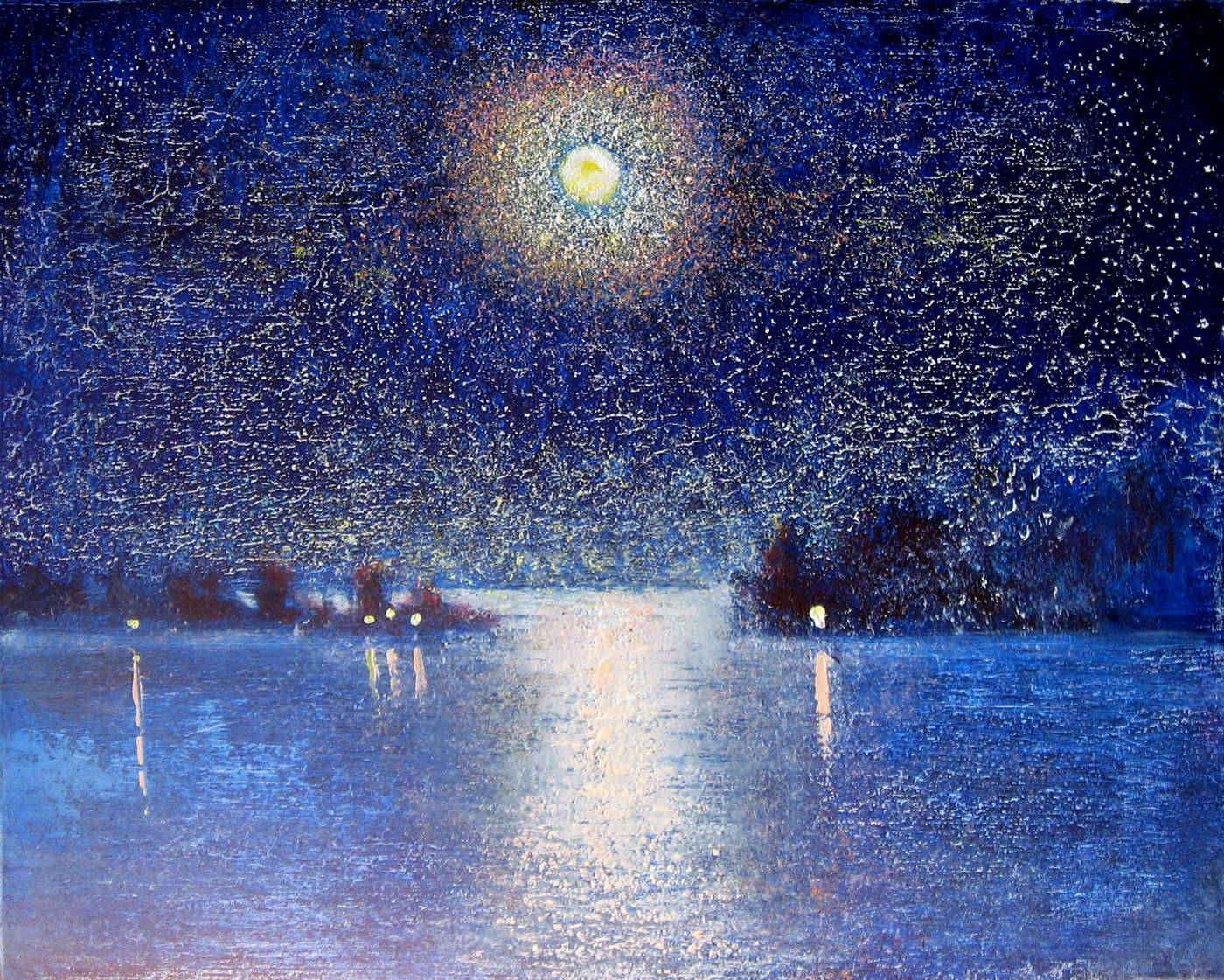 Obraz jest jak magia nocnego nieba rozlanego na płótnie. Dominują tu odcienie niebieskiego, które przechodzą w subtelną grę z głębokimi czerniami i skrzącymi się bielami. W centrum kompozycji jaśnieje księżyc otoczony aurą światła, jak delikatny pierścień rozświetlający noc. Na tafli wody odbija się jego blask, tworząc lśniącą ścieżkę, która prowadzi wzrok w głąb obrazu. To trochę jak wielki ocean marzeń. Drobne kropki, przypominające gwiazdy, rozsiane są jakby ktoś porozsypywał cukier na ciemnym stole. Artysta użył techniki impastu, co nadaje dziełu charakterystyczną teksturę i żywość. Atmosfera jest spokojna, pełna wyciszenia, wprowadzając odbiorcę w stan dreamy contemplation. Uczucie nostalgii miesza się z poczuciem odkrywania czegoś nieuchwytnego. Dla mnie to przypomnienie, że piękno natury kryje się w szczegółach. Patrząc na obraz, można poczuć, jak serce powoli zwalnia. To takie „wow”! Stylistyczne zestawienie intensywnie emocjonalnych barw i subtelności tonalnych fascynuje i zaprasza do zadumy.
