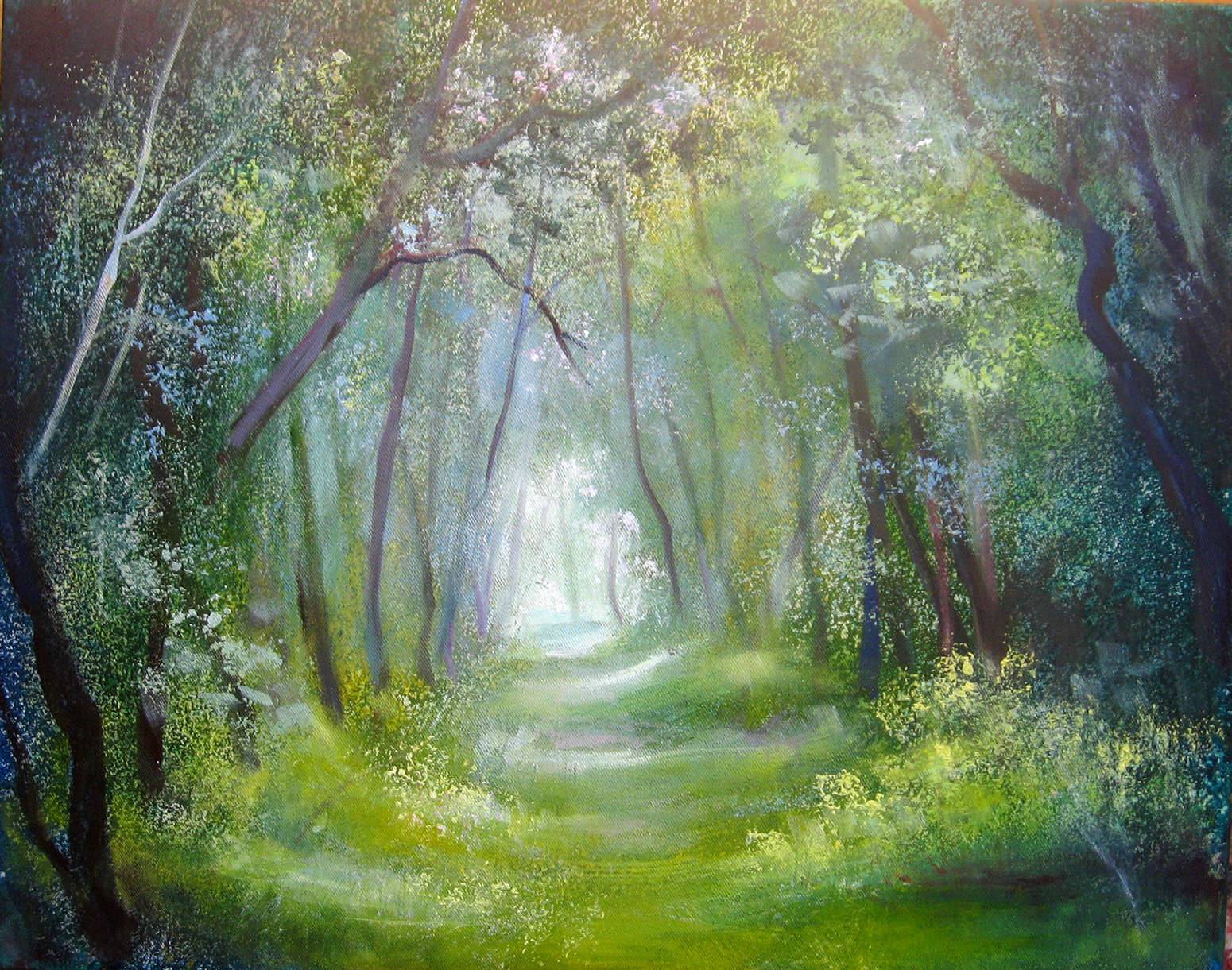 Obraz przedstawia mistyczny las, pełen zielonych odcieni, od ciemnych szmaragdów po jaśniejsze, niemal żółtawe przebłyski światła. Drzewa o smukłych, wygiętych pniach tworzą naturalną aleję, prowadzącą w głąb tajemniczej sceny. Światło delikatnie wchodzi przez liście, dając efekt połyskującego dywanu, który przyciąga wzrok. Atmosfera emanuje spokojem i magiczną aurą. Czujemy się, jakbyśmy byli w bajce, gdzie każdy krok mógłby odkryć nowe sekrety. Artysta wykorzystał technikę impasto, tworząc złożone tekstury i głębię. Pociągnięcia pędzlem są niemal taneczne, a użycie cieniowania dodaje dymensionality. Obraz może wywoływać uczucie nostalgii lub tęsknoty za dziką przyrodą, ucieczką od zgiełku codzienności. Wow, to miejsce wygląda jak z bajki! Może tam mieszkać wróżka albo smok. Odbiorca zostaje porwany w podróż przez marzenia, a „Nature” staje się ucieczką dla umysłu. Czasem, patrząc na takie obrazy, czuję się zrelaksowany, a zarazem pobudzony do refleksji. Podziwiam, jak prostota kolorów może wyrazić tak kompleksową paletę emocji.