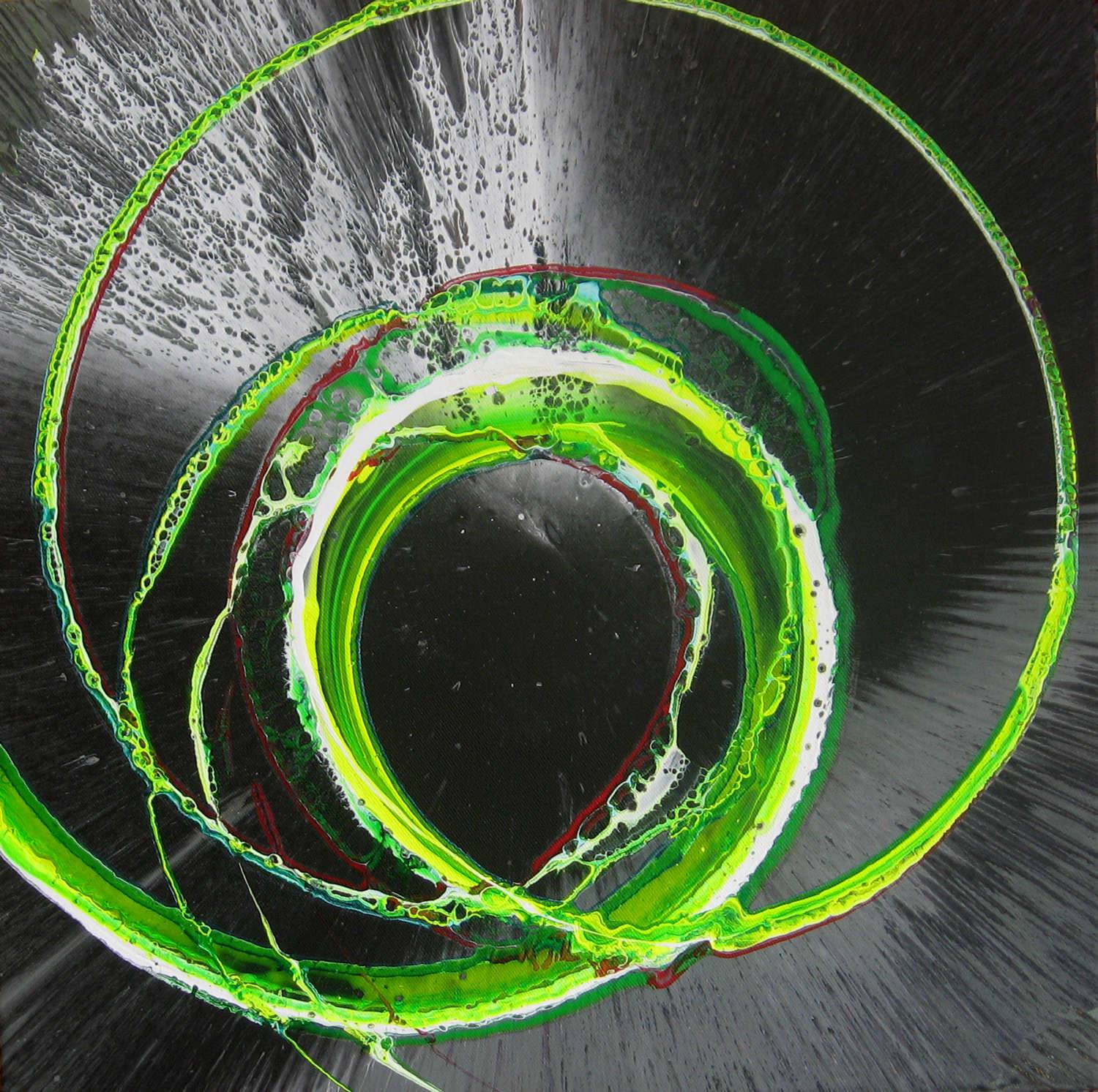 Na tym hipnotyzującym obrazie, mocne pasy zieleni wirują energicznie na tle pochmurnej szarości. Barwy te rozlewają się, przeplatając z subtelnymi czerwonymi akcentami, niemalże eksplodującymi na czarnym tle. Te intensywne kolory są jak neon lights, rozświetlające ciemność. Kompozycja przywodzi na myśl żywiołowy taniec natury, gdzie chaos spotyka się z harmonią. Artysta użył techniki płynnego malarstwa, gdzie farby swobodnie mieszają się, tworząc fascynujący spektakl kształtów. Atmosfera obrazu jest dynamiczna, pełna ruchu, jakby zatrzymywała chwilę w wirującym ruchu czasu. Patrzę na to dzieło i czuję, jakby mnie wciągało do środka tej zawieruchy. To jak podróż do wnętrza duszy, pełna nieprzewidywalnych zwrotów. Można zobaczyć w nim energię życia, gdzie spokój i chaos znajdują swoje miejsce obok siebie. Stylem przypomina nowoczesny ekspresjonizm, gdzie emocje wylewają się poza ramy płótna, dotykając każdego widza. Dla mnie jest to jak patrzenie na wirujący kosmos, gdzie wszystko jest jednocześnie w ruchu i w równowadze. Aż chce się krzyknąć jak dziecko: "Wow, to jak kręciołek!"
