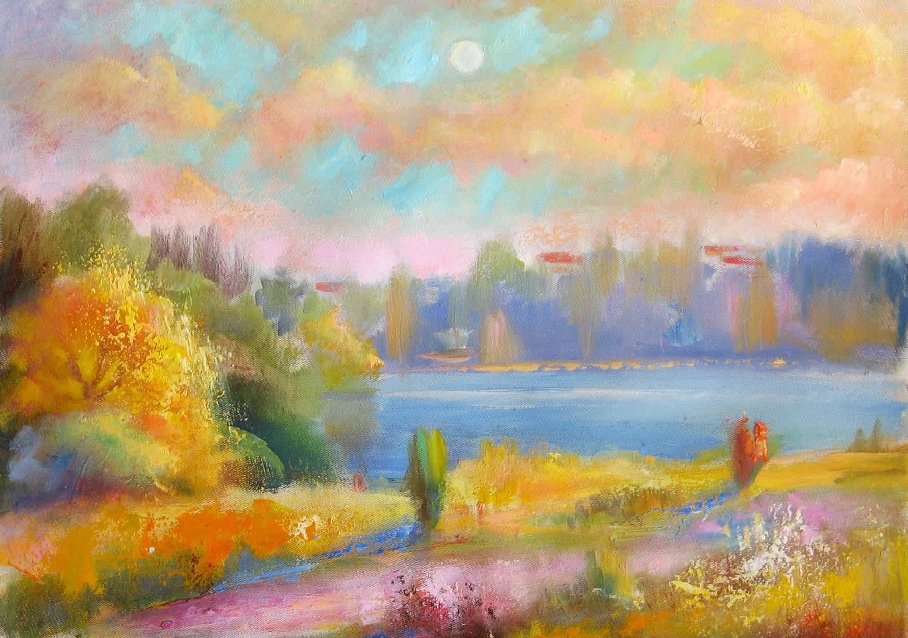 Obraz przedstawia malowniczy krajobraz, w którym dominują ciepłe odcienie żółci, pomarańczy i różu, kontrastujące z zimnymi błękitami nieba. Kształty są rozmyte i delikatne, tworzące iluzję mgły unoszącej się nad jeziorem. Drzewa po lewej stronie majaczą niczym duchy natury, podczas gdy w centrum wszystko skupia się wokół spokojnej tafli wody. Atmosfera jest oniryczna, niemal magiczna, jakby zapraszała do świata snów. Artysta użył techniki impastu, nakładając farbę grubymi pociągnięciami pędzla, co nadaje kompozycji fakturę i dynamikę. Pastelowe kolory tworzą harmonię, przyciągając wzrok i zachęcając do zatrzymania się na chwilę dłużej. Czuć w tej pracy spokój, ale i pewną melancholię, jak w nostalgicznym wspomnieniu z dzieciństwa. "It makes me feel calm" — można by to ująć jednym zdaniem, podkreślając emocjonalny rezonans dzieła. Dla dziecka obraz mógłby przedstawiać "tęczę na ziemi", pełną kolorowych kwiatów i tajemniczych postaci spacerujących w oddali. To jak spacer po magicznym ogrodzie, gdzie wszystko jest możliwe. Obraz kusi, by wejść w jego świat, poczuć wiatr we włosach i cieszyć się chwilą. Fascynujący i zarazem wyciszający, ten obraz z pewnością zostaje w pamięci, dotykając każdej struny wrażliwości oglądającego.