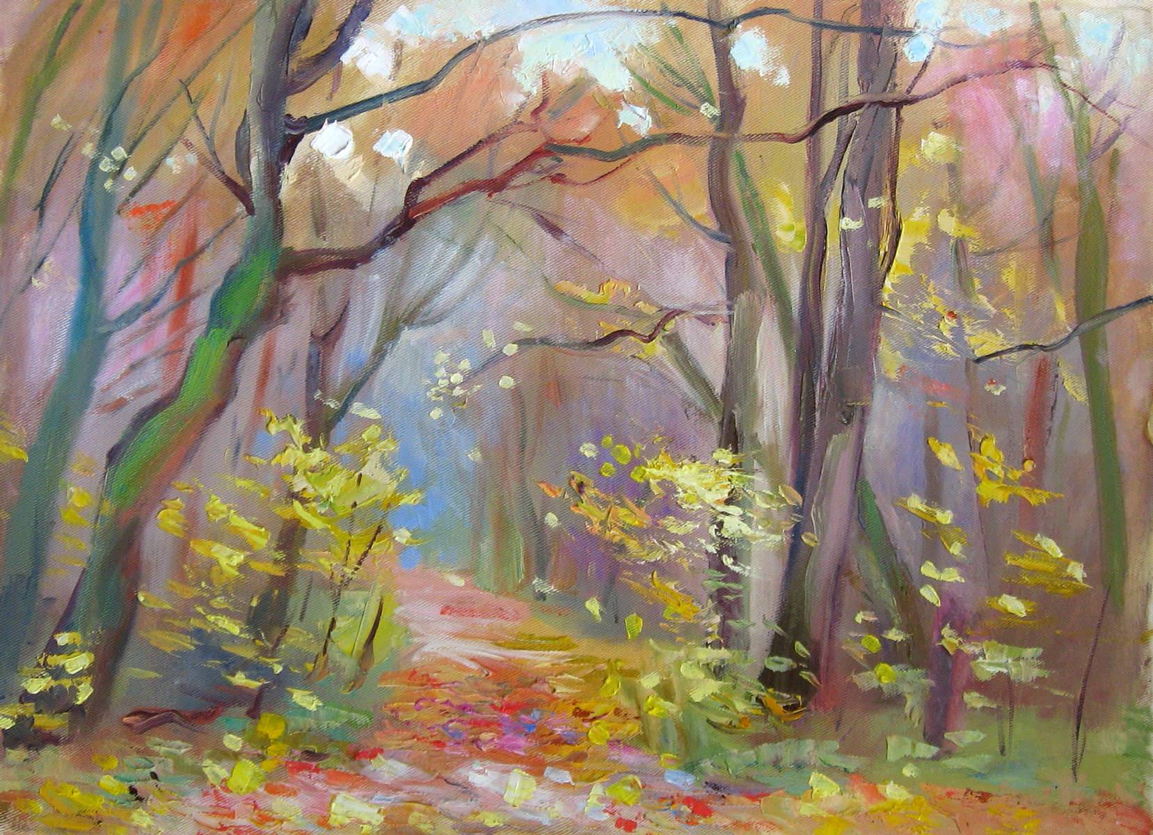 Na obrazie widzimy jesienny las pełen barw i ciepła. Liście drzew przybierają odcienie żółci, pomarańczy i czerwieni, kontrastujące z zielenią mchu pokrywającego pnie. Ścieżka wiedzie nas w głąb obrazu, wydaje się zapraszać na spacer, a balans kolorów sprawia, że całość jest niesamowicie harmonijna. Artysta użył tu techniki impasto, która sprawia, że pociągnięcia pędzla są wyraźne i tekstura nabiera trójwymiarowości. Ten leniwy klimat jesieni, kiedy dzień leniwie ustępuje miejsca wieczorowi, nadaje obrazowi wyjątkowo nostalgiczną atmosferę. Czuć, że powietrze jest rześkie, a jednak przyjemnie chłodne. Myślę sobie: wow, chciałbym taką chwilę uchwycić na zawsze. Taki widok przypomina beztroskie, dziecięce spacery po lesie. „Liście spadają jak kolorowe deszczyk!” mogłoby powiedzieć dziecko, zachwycone tym widokiem. Mimo wszystko obraz wywołuje różne emocje—od spokoju po tęsknotę. Zmieniające się pory roku często budzą myśli o przemijaniu. Autumn magic, nic dodać. To prawie jak opowieść, którą artysta subtelnie maluje, zostawiając odbiorcę w zadumie. Kto wie, co kryje się dalej w tej ścieżce?