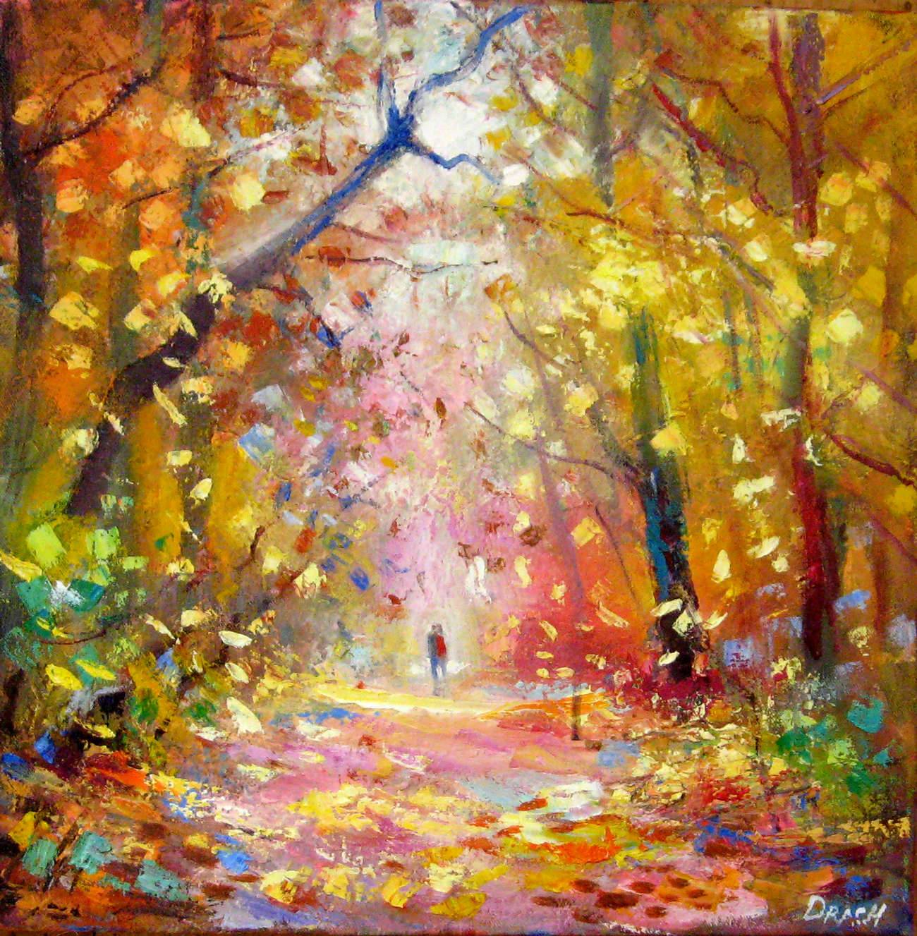 Obraz przedstawia zaczarowany jesienny las pełen kolorów, które wręcz eksplodują na płótnie. Dominują ciepłe żółcie, pomarańcze i głębokie czerwienie, tworząc migoczącą mozaikę liści. Wyobraźcie sobie, jak to musi wyglądać, kiedy słońce przenika przez korony drzew, rozświetlając każdy zakamarek. W centrum kompozycji widzimy wąską ścieżkę, która zanika w oddali, prowadząc ku tajemniczej postaci. To miejsce wygląda jak wyjęte z bajki, może nawet zaczarowane. Artystyczna technika to prawdziwa mieszanka stylów. Widoczna jest tu impresja, gdzie pojedyncze pociągnięcia pędzla i intensywność barw tworzą magiczny, niemalże oniryczny nastrój. Na pierwszy plan wysuwa się dynamika i ruch. Można by rzec, że liście tańczą w rytm jesiennego wiatru, a wszystko to wydaje się tętnić życiem. Obraz emanuje poczuciem spokoju i harmonii, ale jednocześnie tajemnicy. Może czasem i nostalgia zapuka do naszych drzwi, przywołując wspomnienia spacerów po jesiennym lesie. "Patrz, mamo, ten obraz jest pełen kolorów jak moje kredki!" - mogłoby powiedzieć dziecko, zachwycone bogactwem odcieni. To mógłby być idealny "escape" od codzienności, przeniesienie się do miejsca, gdzie czas płynie wolniej. Trzeba tu przyznać, że artysta miał nie lada talent, bo udało mu się uchwycić nie tylko piękno natury, ale i esencję chwili.
