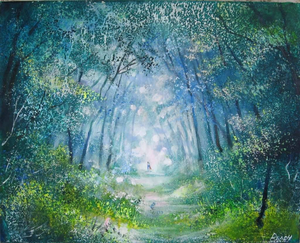 Na tym obrazie widzimy bajkowy las. Dominują odcienie zieleni i błękitów, które przenikają się z białymi plamami światła, tworząc iluzję promieni słonecznych przedzierających się przez gęste korony drzew. Gałęzie tworzą niemalże tunelowy efekt, kierując wzrok ku centralnej części kompozycji. To miejsce wygląda, jakby ktoś tam czekał na nas przy końcu ścieżki. Styl malarski jest nieco impresjonistyczny, z delikatnymi, rozmytymi konturami, co nadaje obrazowi lekkości i tajemniczości. Atmosfera jest spokojna, pełna ciszy i subtelnego piękna natury. Feeria barw wywołuje u widza uczucie zachwytu i nostalgia za dawnymi, nieodkrytymi zakamarkami przyrody. To tak, jakbyśmy cofali się do chwil beztroski i dziecięcej ciekawości. Wyobraź sobie, że odwiedzasz ten las i nagle czujesz magiczną energię. Wszystko dookoła jest takie "mystical", że aż zapiera dech. Może nawet przypominasz sobie dziecięce opowieści o zaczarowanych miejscach, gdzie przygoda zawsze czeka tuż za rogiem. To obraz, który przenosi w inne światy i zaprasza do zapomnienia o codzienności. Magia wisi w powietrzu. Wiesz co? Ja bym tam chiał pobiec, po tą ścieżką!