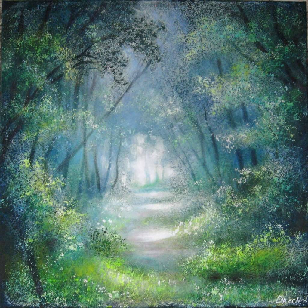 Obraz przedstawia malowniczą leśną ścieżkę, skąpaną w zieleni i błękitach. Kompozycja tworzy tunel utworzony z drzew, który prowadzi ku jasnemu światłu na horyzoncie. Fajnie wygląda ta świetlista mgiełka, która delikatnie przenika przez liście, tworząc magiczną atmosferę tajemniczości. Kolory są przytłumione, delikatne, przez co nadają uczucie spokoju i harmonii. Artysta użył techniki impresjonistycznej, posługując się drobnymi, skrzętnie wykonanymi pociągnięciami pędzla, które nadają teksturę i głębię. Patrząc na ten obraz, czujemy jakbyśmy zaraz mieli wejść do jakiegoś elfy'iego świata pełnego nieodkrytych zakamarków. To jak bajka, którą chcesz przeżywać. Jestem pewna, że nawet siedmiolatek poczułby się zaczarowany tym miejscem, mówiąc: "Chciałbym mieć domek w takim lesie". Urok i tajemnica w jednym. Tło lasu zanika w mglistym świetle, co sprawia, że czujemy ten "pull" ku niewiadomej. Całość emanuje ciszą, która mówi więcej niż tysiąc słów, skłaniając do refleksji nad pięknem nieskażonej natury. Zachwyt nad tym krajobrazem może sprawić, że każdy stanie na moment, by odetchnąć. Ta leśna opowieść jest swoistą metaforą podróży przez życie, pełną zakrętów i niespodzianek, prowadzącą ku jasnym chwilom. Wow, po prostu wow.