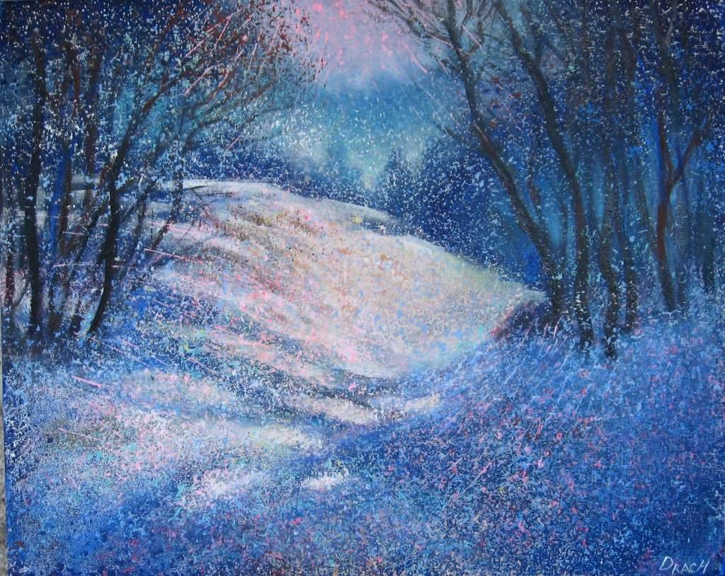Obraz przedstawia zimowy pejzaż, gdzie dominuje paleta chłodnych, niebieskich odcieni, przenikających się z delikatnym różem i bielą. Gałęzie drzew odciskają się ciemnymi liniami na tle rozmytych śnieżnych wzgórz. Dominujący błękit wprawia w nastrój spokoju, aż można by powiedzieć - magiczny. Artysta wykorzystał technikę impastu, tworząc teksturę, która nadaje powierzchni obrazu głębię i dynamikę. Widok może wywołać emocje nostalgii lub podziwu dla zimowej natury, przypominając beztroskie dziecięce sanki. Styl malarski przypomina dreamy impresjonizm, gdzie detale ustępują miejsca wrażeniom. Jak tu pięknie! Taki obraz potrafi teleportować myśli w dal, gdzie śnieg jak puder miękko opada na wąską ścieżkę. Autor umiejętnie bawi się światłem, podkreślając śnieżycę „dancing” w powietrzu. Zachwyca ta subtelność i ulotność chwili uchwycone jednym pociągnięciem pędzla. Obraz koncentruje się na emocjach, a nie na dosłownym przedstawieniu zimy, co sprawia, że można go interpretować na wiele rożnych sposób.