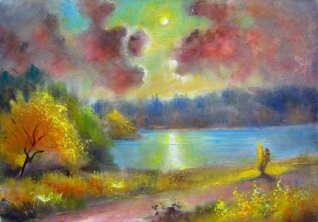 Obraz przedstawia idylliczny krajobraz nad jeziorem. Oczom widza ukazują się nasycone barwy – złociste, pomarańczowe i zielone, przywołujące klimat wczesnej jesieni. Na pierwszym planie dostrzegamy parę spacerującą wzdłuż brzegu, co dodaje kompozycji delikatnego, sentymentalnego akcentu. W oddali las kryje się w tajemniczej mgle. Wow, jak ładnie, mamo! Ciepłe, pastelowe kolory nieba przechodzą w intensywne, burzowe chmury. Atmosfera jest spokojna, ale pełna emocjonalnej głębi. To jakby patrzeć na wspomnienia z dzieciństwa. Namalowane pociągnięcia pędzla są dynamiczne, lecz subtelne. Artysta zastosował technikę impastową, co dodaje tekstury i żywotności do sceny. Obraz jest pełen nostalgii, przypomina nam o spokojnych chwilach spędzonych na łonie natury. Czuć w nim freedom i nieograniczone możliwości, jakie oferuje otwarta przestrzeń. Kompozycja jest zarazem chaotyczna i harmonijna, wywołując w odbiorcy różnorodne uczucia. Czuję się, jakbym tam był, biorąc głęboki oddech wśród szelestu liści.