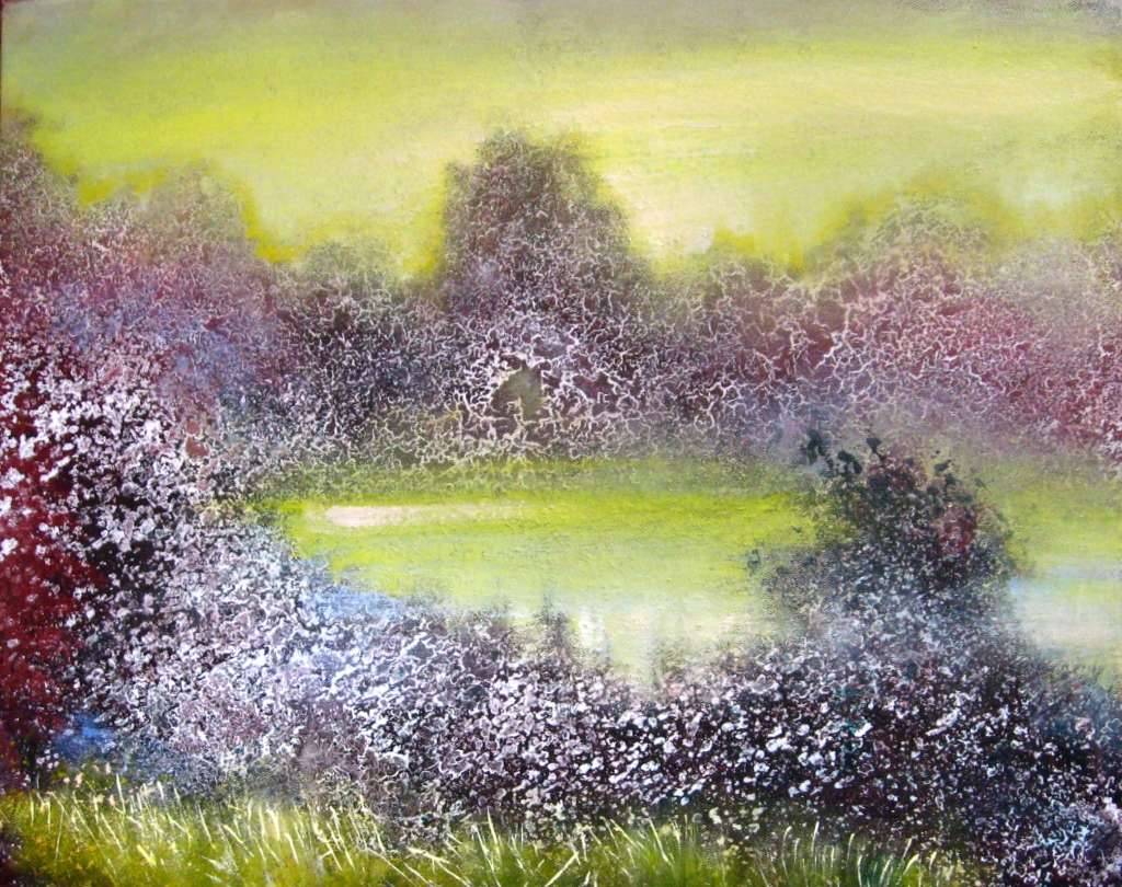 Obraz kipi zielenią, która rozlewa się po całej kompozycji w różnych odcieniach, tworząc przytulne tło dla fiołkowych i czerwonych zarysów drzew. Całość przypomina zamglony poranek, kiedy świat jeszcze nie zdecydował, czy obudzić się do końca. Jest to widok, który może uspokoić, ale i zaintrygować. Na pierwszy rzut oka, to tylko krajobraz, jednak te białe "pajączki" na powierzchni dodają mu pewnej magicznej aury. Coś w stylu dreamlike – niejasnego i nieco tajemniczego. Technika malarska zdaje się łączyć olejne smugi z efektem crackle, co tworzy niepowtarzalną teksturę. Dzieciak może powiedzieć: "Patrz, jakby ktoś sypał cukier na zielone ciasto!" I miałby rację. Ten obraz wzbudza emocje – coś jak nostalgia za miejscem, w którym nigdy się nie było. Myślę sobie, że to sztuka chłonie cię całą, jakby mówiła "zatrzymaj się na chwilę". Prace te są jak trochę czarów, nieomal jakbym widział elfich mieszkańców przemykających w tle. Czuć we wszystkim spokój, a jednocześnie jakąś tęsknotę za czymś.