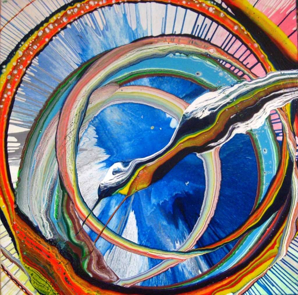 Obraz emanuje eksplozją kolorów, które wirują wokół niebieskiego centrum z ogromną intensywnością. Dominujące odcienie niebieskiego i zielonego łączą się z dynamicznymi liniami czerwieni i pomarańczu, tworząc hipnotyzujący spektakl. Kompozycja wydaje się być chaotyczna, ale jednocześnie harmonijna, z precyzyjnym użyciem techniki pour painting. Artysta z wprawą wykorzystał ruch farby, nadając dziełu efekt tańca barw. Widz czuje nieustanny ruch, jakby obraz żył w swoim własnym rytmie. Atmosfera jest pełna energii, prawie namacalnej. Można poczuć, jak emocje intensyfikują się z każdym spojrzeniem. To trochę jak jazda na karuzeli—dziecięcy zawrót głowy połączony z dorosłą refleksją. Technika swobodnego malowania daje wrażenie nieograniczonej wolności i artystycznej ekspresji, które z pewnością wzbudzają ciekawość u odbiorców. Patrząc na ten obraz, można poczuć przypływ radości i fascynacji. Jest w tym coś niesamowicie magicznego, co przyciąga wzrok. Mówię ci, to pure art! Czuję, jakbyśmy patrzyli na kosmiczny wir, który otwiera przed nami nowe światy. Mój brat powiedziałby: "Wygląda jak gigantyczne lizaki!". Jego energia sprawia, że chce się dotknąć tych wirujących kształtów, zanurzyć w kolorowej przygodzie, która zachęca do odkrywania coraz to nowych historii. Każda warstwa farby opowiada coś innego, inaczej niż poprzednia. To nie jest zwykły obraz - to podróż pełna niespodzianek i odkryć.