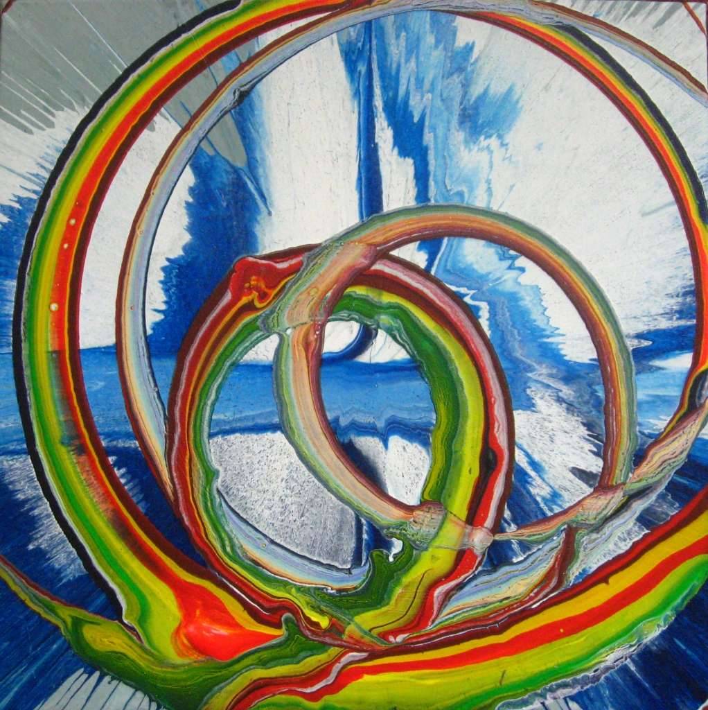 Na obrazie widzimy wir kolorów i kształtów, które zdają się przepływać między sobą niczym rzeka pełna emocji. Dominują żywe barwy: zielony, czerwony, niebieski - jakby artysta chciał opowiedzieć nam historię pełną energii i dynamiki. Koła i spirale, które wiją się przez cały obraz, nadają mu wrażenia ciągłego ruchu, jakby nigdy nie miał się zatrzymać. Atmosfera dzieła jest zaskakująca i ekscytująca. Można poczuć się, jakby było się w środku sztormu pełnego kolorów. Styl abstrakcyjny i sposób nakładania farby, prawdopodobnie techniką pour painting, dodają obrazu charakterystycznego touch-of-chaos. Myślisz sobie: co też artysta chciał przez to wyrazić? Dla niektórych, te kolorowe koliste formy mogą przywodzić na myśl układ planetarny pełen niesamowitości. Inni mogą poczuć lekki niepokój związany z tym, co nieznane. Dla mnie, ten obraz to taki rollercoaster emocji, right? Dziecko powiedziałoby: "To taki kolorowy guziczek, co się kręci i kręci!" Fascynujące połączenie nieprzewidywalności i harmonii przyciąga wzrok i pobudza do refleksji.