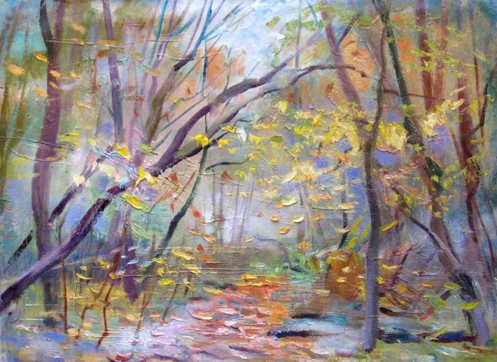 Obraz, na który patrzymy, to prawdziwa uczta dla oczu. Kolory, ach, te barwy! Przydymione odcienie żółci i pomarańczu delikatnie mieszają się z fioletami i błękitami, tworząc niemal mistyczną aurę. Drzewa wydają się tańczyć na wietrze, ich gałęzie splatają się w swobodnej choreografii. W centrum kompozycji mamy złudzenie ruchu, jakby liście właśnie spadały z drzew. Ale pod powłoką spokoju kryje się pewna dynamika. To taki autumn vibe, który sprawia, że człowiek tęskni za ciepłym szalem i kubkiem herbaty. Styl artysty jest swobodny, niemal impresjonistyczny. Pociągnięcia pędzla są zamaszyste, nieco rozmyte, ale to właśnie one nadają obrazowi ten urok niedokończonych chwil. Patrząc na to dzieło, można poczuć się, jakbyśmy stali tuż przy leśnej ścieżce, wsłuchując się w szelest liści pod stopami. Ma się wrażenie, że za chwilę pojawi się wróżka, żeby dopełnić tę baśniową scenerię. Czy to nie zabawne, jak takie dzieło potrafi wywołać u nas emocje? Dla mnie, to jak podróż w czasie do dzieciństwa, do chwil spędzonych na jesiennych spacerkach z rodziną. Taki magiczny, nieco nostalgiczny nastrój. Idealny na chwilę zadumy i ucieczki od daily grind. Czyż to nie jest właśnie to, co sztuka powinna robić?