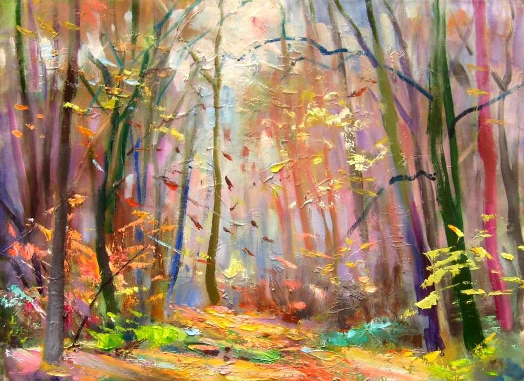 To malowidło wywołuje prawdziwą eksplozję barw i form. Drzewa, niczym tańczące postacie, rozciągają się ku górze, wprowadzając nas w kalejdoskop kolorów—fiołków, różów, pomarańczy i zieleni. Delikatne światło przebija się przez gałęzie, tworząc magiczną grę cieni i świateł. Atmosfera tego obrazu jest zdecydowanie dreamlike, dając wrażenie, że jesteśmy w baśniowym lesie. Artysta zastosował śmiałą technikę impastu, widoczną w głębi pociągnięć pędzla, które przydają dziełu trójwymiarowości. Obraz emanuje spokojem. Czujemy, jakbyśmy zatapiali się w ciszy i harmonii przyrody. Szczerze mówiąc, patrząc na to dzieło, można wręcz poczuć powiew wiatru. To trochę jak stepping into another world, w którym wszystko jest możliwe. "Czy tam mieszkają wróżki?", pytałoby dziecko z zafascynowanym wzrokiem. Może właśnie to jest najpiękniejsze w tym obrazie. Potrafi wywołać u odbiorcy poczucie beztroski i chęć odkrywania, jak u dzieciaka bawiącego się w parku. Piękno leży w kombinacji kolorów i emocji, które przyciągają i nie puszczają.