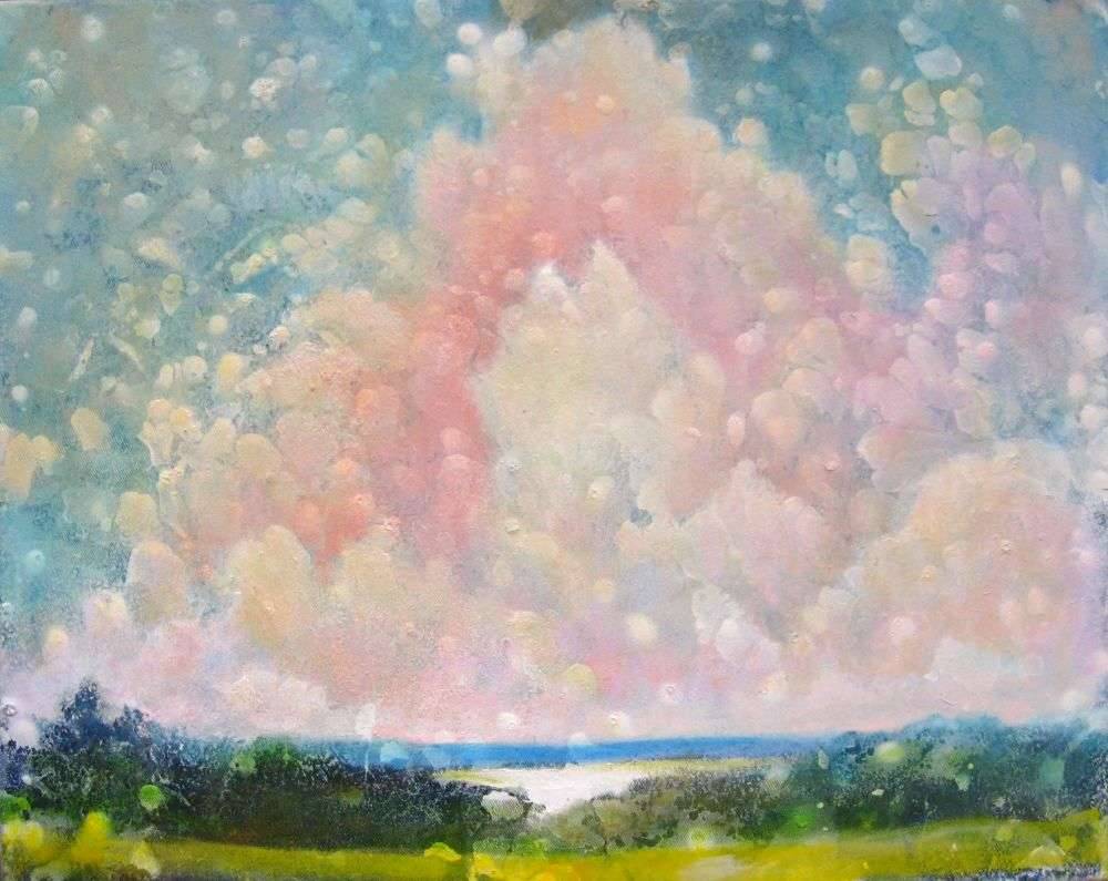 Ten obraz emanuje spokojem i niemal eterycznym klimatem. Na pierwszy plan wysuwa się delikatna chmura barw, gdzie dominuje róż, błękit i subtelne odcienie zieleni. Niebo przypomina baśń, pełne pastelowych kółek, które zdają się unosić i tańczyć w powietrzu. Kompozycja jest zwiewna – dolna część obrazu pokazuje zieloną krainę, może jakieś wzgórza czy pola. Jestem pewna, że to miejsce pachnie świeżą trawą. Atmosfera tego dzieła jest magiczna, taka dreamlike. Człowiek patrzy na tę sielankę i czuje, że czas zwalnia. Artystycznie, obraz można by nazwać impresjonistycznym. Barwy nie są wyraźnie zarysowane, a kształty rozmyte, co potęguje bajkowy nastrój. Użycie techniki impasto daje wrażenie głębi, jakbyśmy mogli niemal dotknąć puszystych obłoków. Dla siedmiolatka: Te chmury wyglądają jak cukrowa wata, którą lubię na festynach! Emocje? Czysta radość i nostalgia. Czuję, że obraz skrywa jakąś tajemnicę, coś, co jest poza zasięgiem wzroku. Dla każdego odbiorcy może oznaczać co innego – dla mnie to marzenie o beztroskim dniu.