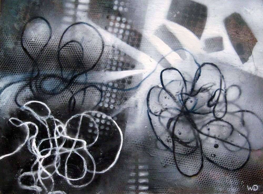 Obraz przedstawia dynamiczną kompozycję pełną wirujących kształtów i subtelnych kontrastów kolorystycznych. Dominują tu odcienie czerni, bieli i szarości, które tworzą sploty przypominające skomplikowane nici pajęczyny. Tworzą one plątaninę o nieregularnych kształtach. Artysta wykorzystuje abstrakcyjne formy, które wprowadzają widza w stan refleksji. Atmosfera obrazu jest tajemnicza i nieco niepokojąca, a także chłodna. Na pierwszy rzut oka dzieło wydaje się chaotyczne, ale przy bliższym przyjrzeniu odkrywa ukryte struktury i rytmy. Styl obrazu jest nowoczesny, z nutą eksperymentalności. Artysta zastosował technikę mieszania farb, co nadaje teksturze zacierające się granice i dodaje głębi. Obecność geometrycznych wzorów i ciągłych linii budzi wrażenie ruchu, przyciągając uwagę odbiorcy. Czuć tutaj pewną nieprzewidywalność, jakby tło skrywało coś więcej, co wywołuje wonderment, a także nadaje mu specyficzny klimat. Emocje? To mieszanka ciekawości i zadumy. "Jak to się kręci!" powiedziałoby pewnie dziecko. Obraz może inspirować do własnych interpretacji życiowego chaosu i potrzeby znalezienia porządku w natłoku myśli. Każdy może zobaczyć w tej abstrakcji coś innego, co zadzieje się w jego umyśle. Dla mnie to jak wizualizacja szalonej energii, która emanuje z wewnętrznej burzy myśli i emocji. Może to być metafora życia z całym jego zamieszaniem i pięknem.