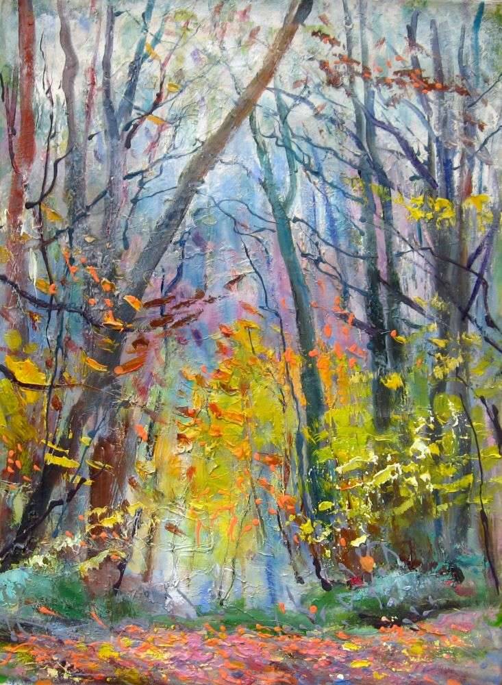 Obraz to prawdziwa eksplozja kolorów i emocji, jaką niesie jesienny las. Dominują tu delikatne, pastelowe odcienie błękitu, żółci i pomarańczu, które niczym magiczna mgiełka oplatają drzewa. Kształty gałęzi wydają się tańczyć w rytmie jesiennego wiatru, tworząc chaotyczną, lecz harmonijną kompozycję. Atmosfera jest jednocześnie tajemnicza i spokojna. Masz wrażenie, jakby drzewa szeptały swoje sekrety. Artysta zastosował technikę impasto, nadając teksturę liściom i pniom, co daje efekt niemal trójwymiarowy. Patrząc na obraz, czujesz lekkie ukłucie nostalgii. Może za chwilę wyskoczy zza drzewa jakieś zwierzątko? Każdy pociągnięcie pędzla zdaje się przemyślane, choć pełne swobody. To "a walk in the woods" w malarskim ujęciu. Dzieciak by powiedział: "Drzewa są jak spaghetti!". Takie obrazy sprawiają, że zaczynasz się zastanawiać, ile tajemnic kryją w sobie zwykłe miejsca. Nie można oderwać oczu, bo w sercu tli się tęsknota za naturą.