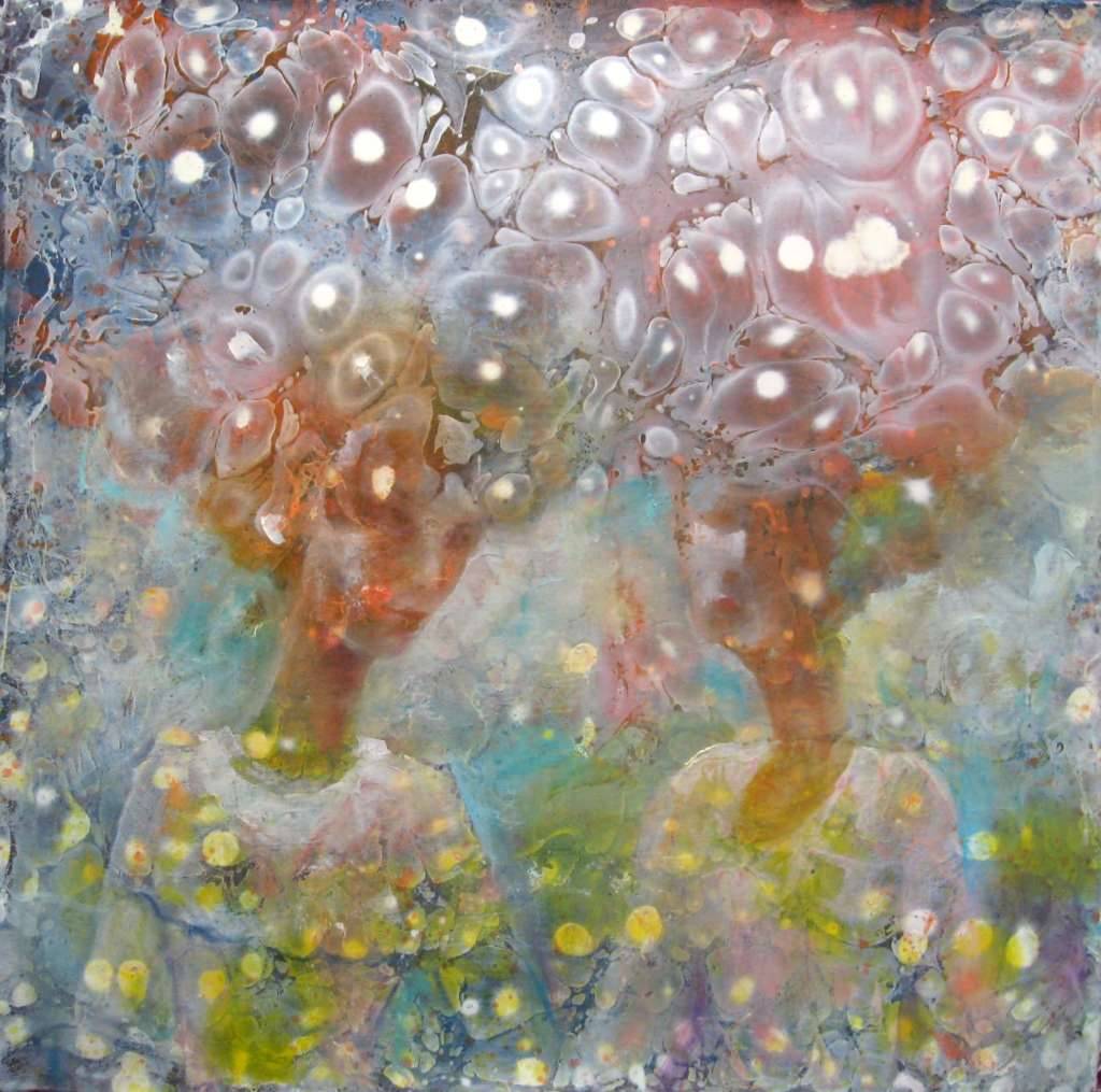 Obraz emanuje tajemniczością, splątany chmurami barw i kształtów, które przenikają się jak w marzeniu. Dominują tu delikatne pastele – błękity, róże i żółcienie, które tworzą subtelny kalejdoskop. Kompozycja zdaje się płynąć, niczym mgła oplatająca dwie postacie czy może cienie. Atmosfera jest eteryczna, trochę zadumana, jak chwila zamyślenia nad kubkiem herbaty. Technika, którą posłużył się artysta, sugeruje zabawę teksturą i pewien chaos, niczym w stylu pouring, który zachwyca swoją nieprzewidywalnością. To taki obraz, przy którym można się zatrzymać na dłużej, bawic oczami, szukać sensu. Nie ma tu jasności przekazu, co może trochę intrygować lub frustrować, bo każdy zobaczy coś innego! Dla mojej młodszej siostry to są wróżki w lesie. Wyobraźnia zaczyna pracować, bo te wzory, które przypominają bąbelki, sugerują świat baśni. Czuję, jakby artysta chciał nas wprowadzić w stan reflective. Może to kod międzywarstwowy pełen emocji, nieuchwytny i osobisty. Praca wzbudza ciekawość i chęć odkrycia, co kryje się za tymi mglistymi konturami. A może, po prostu, to tylko piękny chaos.
