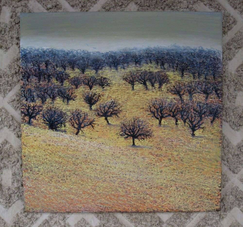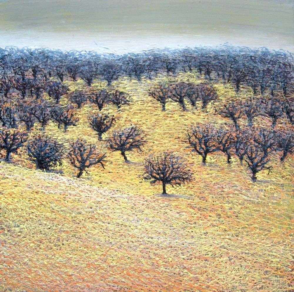 Na obrazie widzimy łąkę delikatnie zabarwioną różnymi odcieniami żółci i brązu, przez co teren wydaje się niemal falować. Drzewa, niczym czarne koronkowe kształty, rozrzucone po krajobrazie, wyróżniają się na tle pastelowego nieba. Ich surowe i nagie gałęzie tworzą niemal graficzny kontrast z miękkim, teksturowanym tłem. Atmosfera jest spokojna, lecz jednocześnie nieco melancholia wisi w powietrzu, jakby przyroda szykowała się do snu. Technika impresjonistyczna, z wyraźnym pociągnięciem pędzla, dodaje życia i dynamiki. Patrząc na obraz, można poczuć nostalgiczny klimat jesiennego popołudnia. Może to przypominać spacer po parku w chłodny dzień. Artysta użył kolorów i faktur, by sprawić, że krajobraz wydaje się niemal namacalny. Wow, jak to wygląda cudownie! Kompozycja jest przemyślana, prowadząc oko widza głębiej w perspektywę. To dzieło zdecydowanie zasługuje na uwagę. Można niemal usłyszeć szelest liści pod stopami. Czasami sztuka potrafi mówić wprost do serca po prostu.