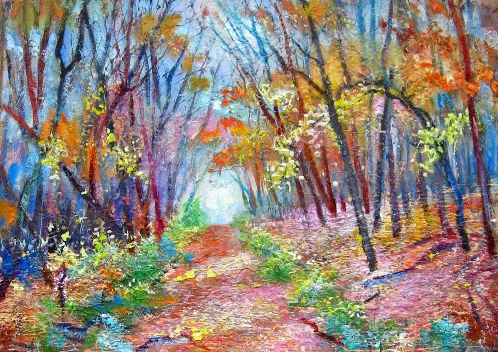 Obraz przedstawia malowniczą ścieżkę prowadzącą w głąb kolorowego lasu. Dominują tu intensywne kolory - czerwienie, pomarańcze, żółcie, które tworzą tę fantastyczną, jesienną scenerię. Drzewa są smukłe, ich gałęzie wyciągają się ku niebu, a między nimi prześwituje błękitne niebo. Kompozycja jest dynamiczna, jakby natura zatrzymała się na chwilę w pełnym ruchu. Całość emanuje spokojem, choć nie bez nutki nostalgii. Czujesz, że jesień tu rządzi, oferując ostatnie ciepło przed zimową ciszą. Pociągnięcia pędzla są szybkie i zdecydowane, co nadaje obrazowi ekspresyjny styl. To jakby patrzeć na krótki moment uchwycony w chaosie kolorów. Obraz przywołuje na myśl spacer w parku, gdzie każde zetknięcie stopy z brukiem szeleści. Może to być miejsce, gdzie wracamy myślami, gdy myślimy o "home". Jesień zawsze wydaje się być nieskończoną opowieścią - pełną ciepłych herbat i wieczorów pod kocem. "Ten las wygląda jak z bajki!" krzyknęłoby dziecko, widząc to dzieło. Każdy liść zdaje się szepczeć swoją historię. Nie można też nie docenić tej techniki, która łączy impresjonistyczne zacięcie z ekspresjonizmem – splatając się w harmonijną całość. Obraz ten nie tylko cieszy oko, ale przede wszystkim sprawia, że serce bije trochę szybciej, przypominając o magii ukrytej w prostych, codziennych widokach.