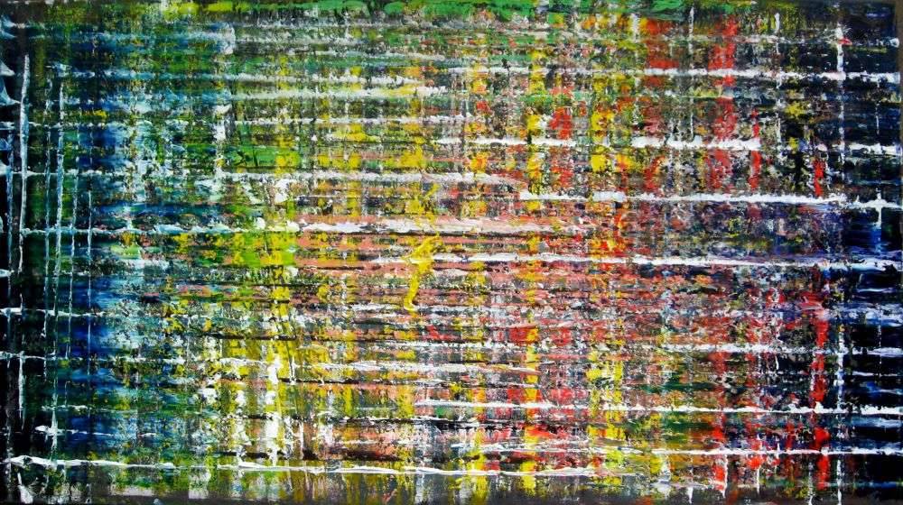 Otwierając się na pierwszy rzut oka, obraz wciąga nas w swój hipnotyczny wir kolorów. Mieszanka błękitów i zieleni przeplata się z odcieniami żółci i czerwieni, tworząc kalejdoskopowy chaos. Kompozycja nie ma jednego punktu centralnego, co sprawia, że oczy błądzą, szukając porządku w tej kolorowej dżungli. Technika użyta przez artystę przypomina abstrakcyjną improwizację, a może nawet swobodną expresję. Gruba warstwa farby nakładana energicznymi pociągnięciami pędzla nadaje dziełu głębię i dynamikę. Atmosfera tego obrazu to mieszanka tajemnicy i niepokoju, jakbyśmy zaglądali do innego wymiaru pełnego niewyjaśnionych sił i energii. Patrząc na to, przypominam sobie, jak malowałem palcami w przedszkolu. Czy to trochę nie przypomina dziecięcej radości tworzenia? Obraz wydaje się pulsować, emanując emocjami, które mogą być interpretowane zarówno jako confusion, jak i zachwyt. Dla mnie to jak podróż przez labirynt myśli, gdzie każdy kolor symbolizuje inną emocję czy wspomnienie. Może patrząc na ten obraz, poczujemy nagły przypływ niespokojnych myśli, ale także iskierkę nadziei na odkrycie czegoś magicznego. Ciekawi mnie, co autor miał na myśli, tworząc ten złożony taniec barw. Obraz jest żywy, ciągle się zmieniający zależnie od kąta spojrzenia i otoczenia. Coś jakbywyjątkowa symfonia dźwięków zamknięta w nieruchomej formie. Fascynujące, prawda?