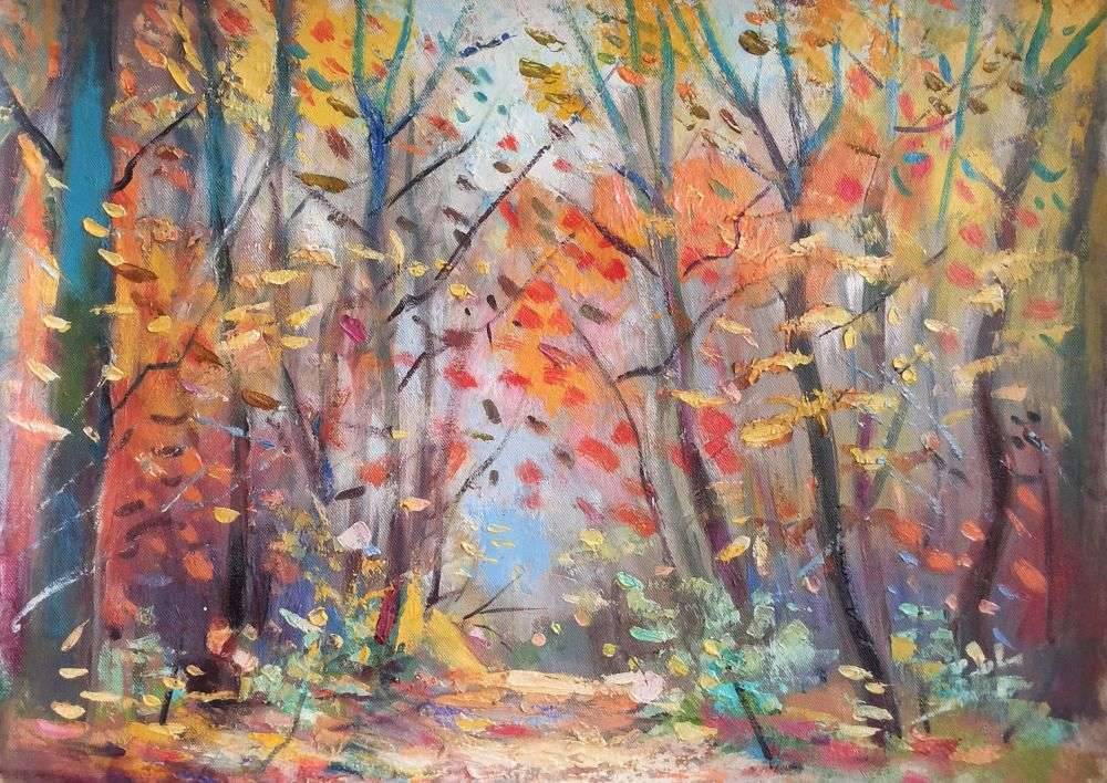 Na obrazie widzimy bajkowy las, otulony jesienną aurą. Kolory są żywe, przeważają ciepłe odcienie pomarańczy, czerwieni i złota, które delikatnie przeplatają się z chłodniejszymi tonami błękitów. Drzewa wznoszą się ku górze niczym smukłe, taneczne sylwetki. Ich gałęzie pełne są opadających liści, co nadaje obrazowi dynamizm. Atmosfera jest spokojna, nieco melancholijna, ale zarazem pełna energii. Mimowolnie czuję zapach wilgotnej ziemi i słyszę szelest liści pod stopami. Artysta wykorzystał technikę impastu, nakładając farby grubo, co dodaje teksturę i głębokość kompozycji. Trochę mi to przypomina obrazy impresjonistów, z tym całym "blurriness", czyli delikatnym rozmyciem. Ten pejzaż malarski wywołuje uczucie nostalgii, tęsknoty za dzieciństwem, kiedy to las był miejscem odkryć. "Patrz, jak fajnie te liście spadają!" - powiedziałoby pewnie małe dziecko. Obraz jest jak poezja, którą trzeba poczuć sercem. Zachwyca i sprawia, że mam ochotę wyjść na spacer w poszukiwaniu piękna dnia codziennego.