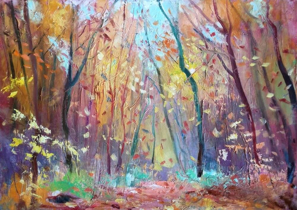 Ten obraz wręcz krzyczy jesienią. Dominują ciepłe barwy: pomarańcze, złoto i czerwień, przełamane nutą fioletu i zieleni na ziemi. Smukłe, pnące się ku górze drzewa nadają kompozycji tajemniczego klimatu, jakby ukrywały sekretną ścieżkę w głąb lasu. Liście wirujące w powietrzu sprawiają, że czuć niemalże jesienny wiatr na twarzy. Jest w tym coś magicznego, jak z bajki. "Patrz, liście tańczą!" - wykrzyknęłoby z zachwytem każde dziecko. Artyściolda zastosował technikę impasato, nakładając farbę grubymi pociągnięciami pędzla, co daje całemu dziełu fakturę i głębię. To jakby artysta chciał, żebyśmy nie tylko patrzyli, ale i dotykali obrazu. Styl trochę impresjonistyczny, choć zdaje się bardziej ostry i ekspresyjny, jakby chciał uchwycić efemeryczne piękno ulotnej chwili. Ten "painting" niesie ze sobą melancholię i radość jednocześnie. Można zastanawiać się nad przemijaniem, ale jednocześnie cieszyć się chwilą w tym urokliwym, jesiennym krajobrazie. Czasem patrząc na takie dzieła, aż chce się wyjść na spacer i zgubić wśród drzew.