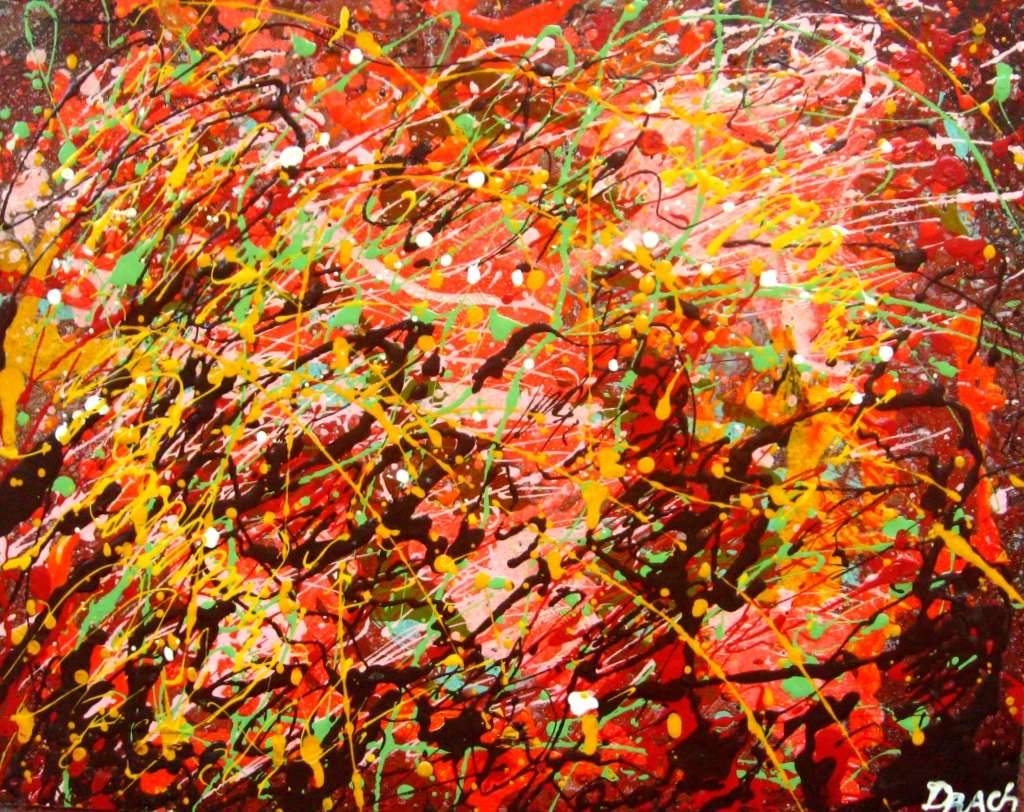 Na obrazie widać istny chaos kolorów i linii, jakby ktoś rozpryskał emocje na płótnie. Dominują czerwienie i pomarańcze, które wirują między zielonymi, żółtymi i białymi smugami. Kompozycja jest dynamiczna i pełna energii. Wygląda, jakby artysta porzucił reguły i postawił na spontaniczność. Atmosfera jest elektryzująca, porusza wyobraźnię. Styl przypomina twórczość Jacksona Pollocka, pełen ekspresji i emocji. Bałagan, ale z jakimś sensem. Technika drip painting, gdzie farba jest rozlewana i kapana, tworzy teatralny efekt. Można poczuć, jak energia artysty przelewa się na płótno. Emocje? Oj, aż chce się krzyknąć Wow! Jakby cała natura eksplodowała w jednym momencie. Dla dzieciaka to mogłyby być confetti na urodzinowym torcie. Dla dorosłych – eksplozja uczuć i myśli. To malarstwo dotyka czegoś wewnętrznego, czujesz się jakbyś był częścią tej twórczości. Chaos, ale i piękno. Każdy zaułek płótna intryguje, zmusza do refleksji. Jest w tym coś magicznego i niespokojnego zarazem.