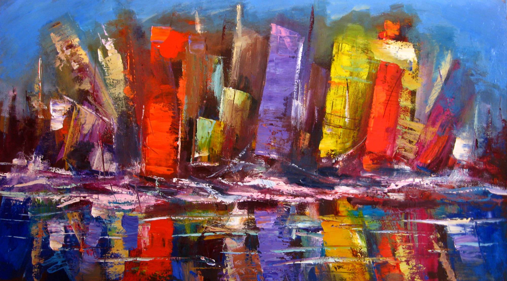 Na obrazie dominują jaskrawe barwy czerwieni, żółci i fioletu, które przeplatają się z chłodnymi odcieniami błękitu i zieleni. Kompozycja pełna energii, zdaje się przedstawiać abstrakcyjny pejzaż miejski na tle ciemniejącego nieba. Wieżowce wyrastają jakby z wody, ich kolorowe odbicia tańczą na powierzchni niczym roztańczony chochlik. Obraz emanuje dynamiczną atmosferą, jakby miasto nigdy nie zasypiało. Artysta zastosował technikę szerokich pociągnięć pędzla, mieszając kolory na płótnie w sposób, który nadaje dziełu ruch i głębię. Styl przypomina nieco impresjonizm, jednak w bardziej nowoczesnej, surowej formie. Obraz wywołuje emocje ekscytacji i zachwytu, a jednocześnie zmusza do refleksji nad zgiełkiem współczesnego życia. To tak jakby miasto było magicznym miejscem, pełnym tajemnic i niespodzianek. Patrząc na obraz, przypominają się codzienne zmagania, ale też chwile euforii, gdy świat wokół nas pulsuje energią. A nagle myślę "Wow, how vibrant!" — te kolory krzyczą, opowiadają historie. Moje osobiste odczucie? Obraz wciąga niczym wir, bez litości dla tych, co próbują oprzeć się jego magnetyzmowi.