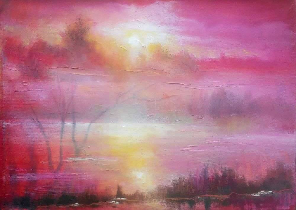 Na obrazie rozciąga się mistyczna kraina pełna różowych, złotych i pomarańczowych odcieni. Widać jak zachód słońca delikatnie opada na tle mgieł, tworząc aksamitną atmosferę spokoju i magiczności. Drzewa z ledwością wyłaniają się spod welonu mgły. To malowidło zdaje się przenosić nas w bajkowy świat, jakby czas stanął tu w miejscu. Technika, jaką posługuje się artysta, przypomina delikatne pociągnięcia pędzlem i miękkie przejścia tonalne. Czuć tu atmosferę dream-like, gdzie rzeczywistość miesza się z marzeniem. Patrząc na ten obraz, można poczuć wewnętrzny spokój. Może przypominać letnie wieczory nad jeziorem, kiedy czas płynie wolniej. Dla kogoś, kto zawsze biegnie, może to być prawdziwy balsam na duszę. Inspiruje do zatrzymania się na chwilę, rozejrzenia się wokół. Dzieci mogą powiedzieć: "O, jakie ładne kolory jak w bajce." Wewnątrz pojawia się nostalgia, może tęsknota za chwilami spędzonymi na łonie natury. Kompozycja jest harmonijna, a kolory współgrają ze sobą nawet jak niebo z ziemią. Artysta bawi się światłem, które rozsiewa się po wodzie, malując świetliste refleksy. Całość składa się na emocjonalną podróż ku wspomnieniom i wyobraźni, jakbyśmy dotknęli kawałka nieba, które nagle stało się na wyciągnięcie ręki.