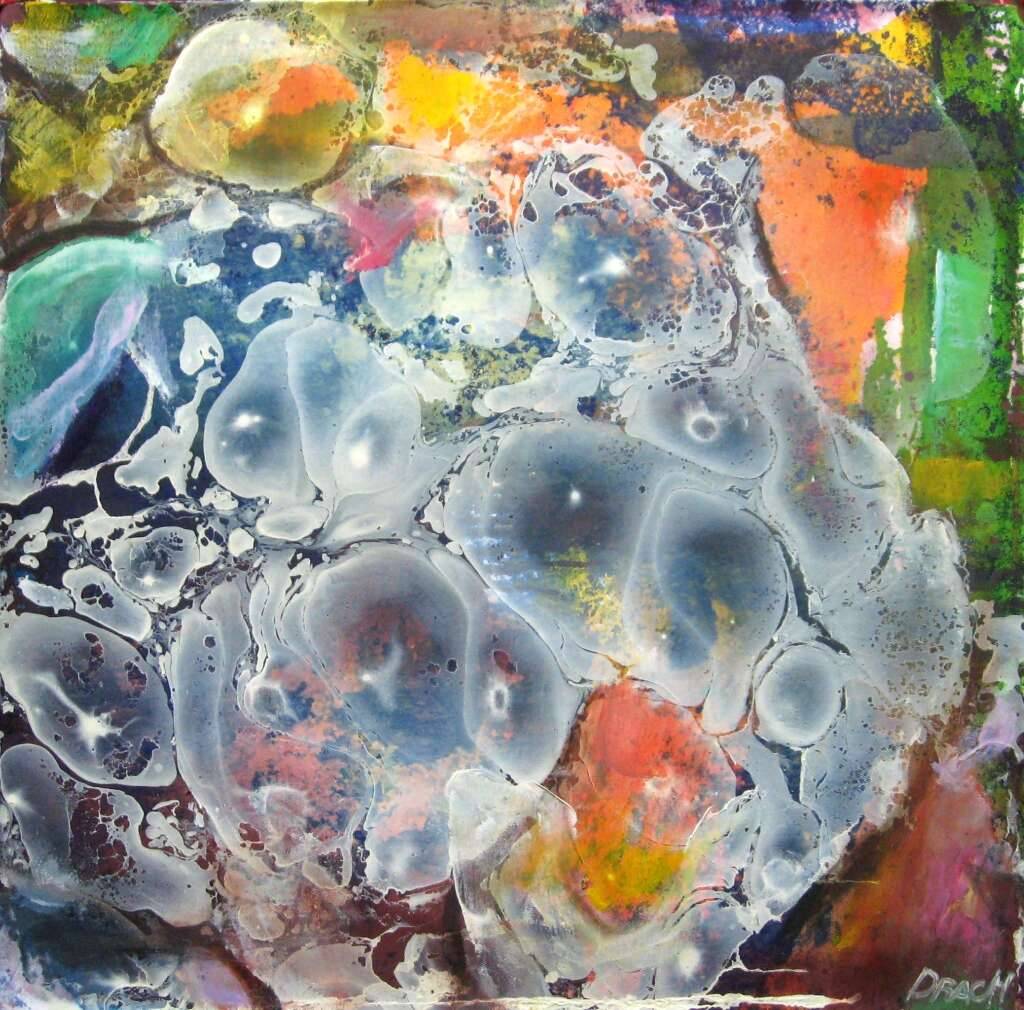 Na obrazie dominują intensywne kolory – od błękitów i zieleni po pomarańcze i czerwienie. Abstrakcyjne kształty przypominają bąbelki unoszące się na powierzchni wody, wzbudzając wrażenie ruchu. Ich organiczna forma kontrastuje z dynamicznym tłem pełnym przeplatających się barw. Atmosfera obrazu jest tajemnicza, prawie oniryczna. Przenosi widza w świat fantazji. Artysta użył techniki mieszania farb, tworząc efekt głębi i tekstury. To trochę jak cosmic journey. Obraz zdaje się szeptać o chaosie i porządku - jednocześnie. Może wywołać różne emocje - od spokoju po lekki niepokój. Malunek ma coś w sobie z dziecięcej zabawy. Patrząc na niego, myślę: “wygląda jak kałuże po deszczu”. Dzieło jest jak kalejdoskop uczuć, pozwala odbiorcy na własną interpretację. Każdy zauważy co innego i to jest w nim magiczne. Możesz poczuć się, jakbyś śnił na jawie. Czasami, gdy na niego patrzę, myślę o tym, jak barwny może być nasz świat.