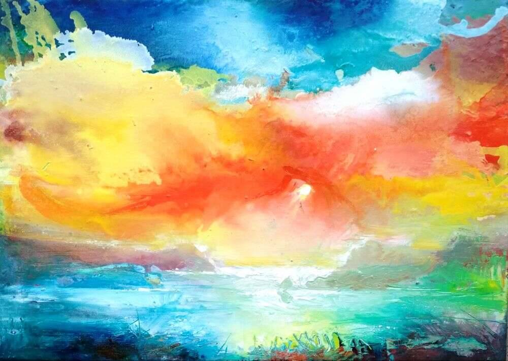 Obraz emanuje eksplozją kolorów, które przypominają wschód słońca nad spokojnym niebem. Przenikające się odcienie pomarańczowych, żółtych i czerwonych barw tworzą gorącą, niemal pulsującą atmosferę w centrum, podczas gdy chłodne błękity i turkusy spowijają dół kompozycji, dając poczucie harmonii i spokoju. Różnorodność form, od rozmytych plam po wyraźne smugi farby, sprawia, że obraz zyskuje dynamikę i ożywa na oczach widza. Wygląda trochę jak magiczny krajobraz albo marzenie! Atmosfera dzieła jest pełna energii, jakbyśmy stali w samym środku emocjonalnej burzy lub na skraju odkrycia. Stosowane techniki artystyczne wskazują na impresjonistyczne podejście do postrzegania kolorów, gdzie światło i cień bawią się na płótnie w nieskończonej grze. Zamierzanie niedoskonałe pociągnięcia pędzla, przypominające technikę "freehand", dodają lekkości i swobody. Obraz może wzbudzać różne emocje. Niektórzy poczują radość i spokój, jakby znaleźli się na rajskiej plaży, inni mogą skupić się na wewnętrznych przemyśleniach, odnajdując w nim elementy chaosu i zmienności. Patrząc na niego, nie sposób nie poczuć się jak w innej rzeczywistości – może to być moment introspekcji, chwila zatrzymania się w biegu dnia. To artwork, który niezależnie od tego, czy go rozumiemy, czy nie, przyciąga i intryguje swoją prostotą i głębią jednocześnie. Chciałbym po prostu tam być.