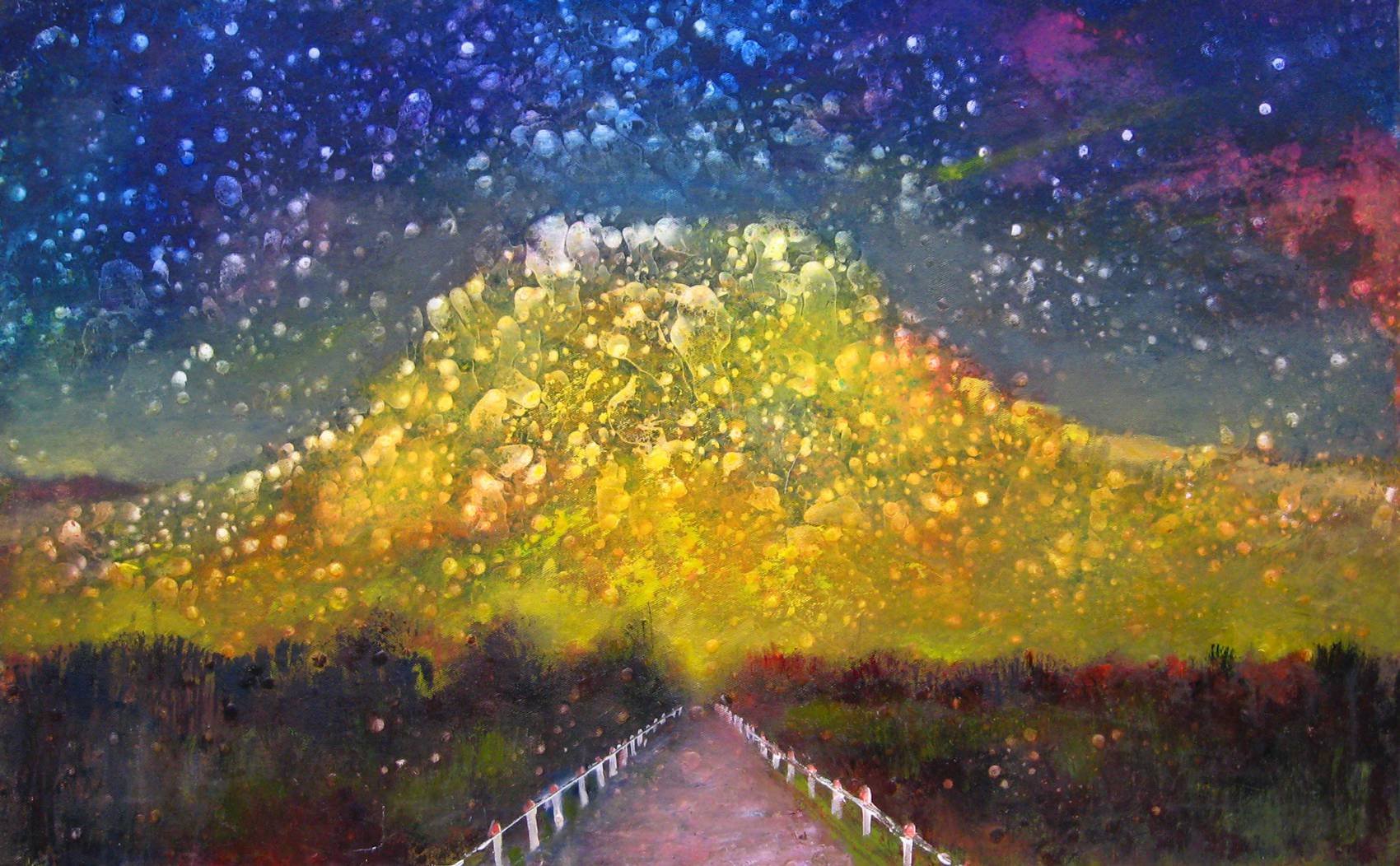 Obraz emanuje tajemniczą magią, jakby ktoś uchylił zasłonę do gwiezdnego świata. Na pierwszy rzut oka widać kalejdoskop intensywnych kolorów: głęboki granat nieba, przechodzący w jaskrawe żółcie i zielenie, przypominające rozświetlony przez słońce wzgórze. W centrum znajduje się prosta droga, prowadząca prosto ku nieznanemu, otoczona ciemnymi krzewami. To jak podróż w nieznane, pełna obietnic i tajemnic. Styl obrazu jest niezwykle dynamiczny, niemal pointylistyczny, z małymi, kolorowymi plamkami przypominającymi gwiazdy rozsiane po całym niebie. Artysta zastosował technikę impasto, co daje fakturze niezwykłą głębię i organiczność. Patrząc na to dzieło, czuje się dziwną mieszankę spokoju i ekscytacji. Pewne detale przywołują uczucie nostalgii, jakby to miejsce z dzieciństwa, a jednocześnie jest elektryzującym zaproszeniem do czegoś nowego. Wow! Prawie jakby ktoś krzyczał surprise! Myśle sobie, że nawet dziecko powiedziałoby: Patrz, drogą do gwiazd! To obraz, który zmusza do refleksji, marzeń i odkrywania siebie na nowo.