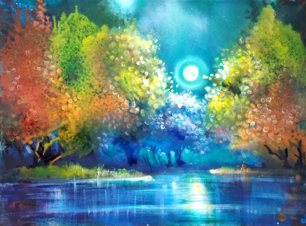 Obraz emanuje bogactwem kolorów i form, tworząc wrażenie magicznej krainy. W centralnej części świetlisty księżyc oświetla taflę wody, dając wrażenie błogiego spokoju. Niebieskie i zielone odcienie przenikają się, tworząc harmonijną kompozycję, która koi zmysły. Drzewa, pełne ciepłych pomarańczy i złotych plam, zdają się tańczyć w blasku nocy. Atmosfera jest tajemnicza, ale jednocześnie toastyczna. Artysta wykonał swoje dzieło techniką jakby delikatnego punktowania, co nadaje mu lekkości i dynamiczności. Dzieło wywołuje emocje, które mieszają się między nostalgią a radością. Myślę sobie: wow, czyż to nie przypomina marzenia sennego z dzieciństwa? Where dreams come alive. Widz może poczuć się jak dziecko odkrywające świat z nieskończoną ciekawością. "Tam jest mnóstwo kolorów!" wykrzyknąłby malec. Patrząc na ten obraz, można odnieść wrażenie, że czas się zatrzymał. To trochę jak ucieczka od codzienności w świat, gdzie wszystko jest możliwe. Czysta, nieujarzmiona fantazja, która budzi w nas tęsknotę za nieznanym.
