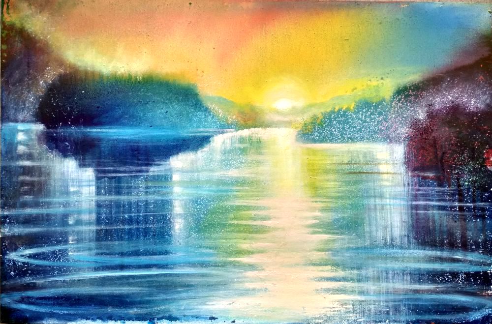 Na obrazie dominuje zachwycająca mieszanka kolorów - od ciepłych odcieni żółci i pomarańczu po chłodne błękity i zielenie. Wyobraź sobie wschód słońca nad spokojnym jeziorem, gdzie jego promienie delikatnie łaskoczą taflę wody. Woda jest magiczna, połyskuje jakby ktoś rozsypał tam brokat. Po lewej stronie widoczne są ciemniejsze, nieco tajemnicze zarysy drzew, które tworzą naturalne ramy dla tej świetlistej scenerii. Atmosfera obrazu jest niemal mistyczna, emanuje spokojem, który prawie można poczuć na własnej skórze. Artysta zastosował technikę sunset blending, gdzie barwy przechodzą w siebie płynnie, co dodaje pejzażowi magii. Użyte szerokie pociągnięcia pędzla potęgują wrażenie ruchu na wodzie, ale też podkreślają statyczność tego wyjątkowego momentu. "Patrz, jak pięknie świeci!" - powiedziałoby dziecko. Obraz może wywoływać uczucia ciepła, optymizmu, a także nostalgii za letnimi porankami. Czujesz słońce na twarzy? Ja czuję. To trochę jak moment „wow”, gdy widzisz coś niesamowitego i nie możesz przestać się gapić.