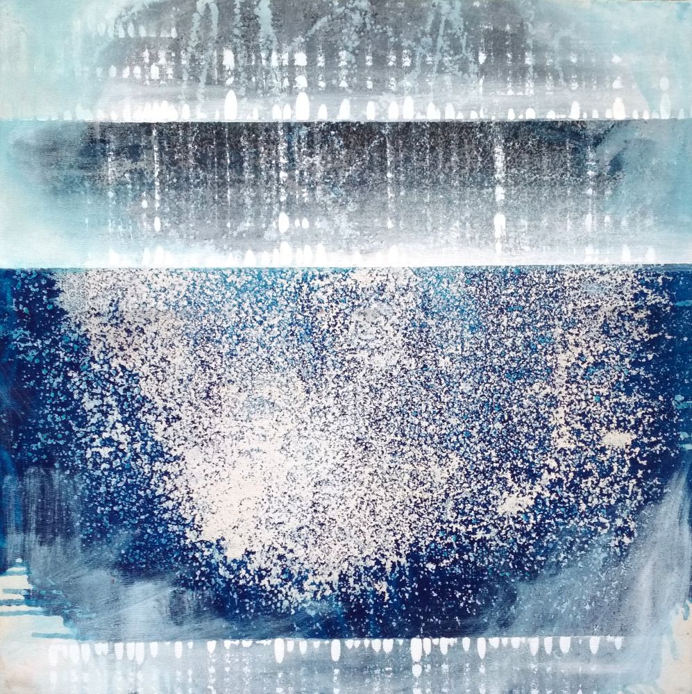 Obraz, który widzimy, przypomina nieco zanurzenie się w oceanie gwiazd. Mnogość kolorów — biel, błękit, granat — tworzy harmonię, która z miejsca koi duszę. Malunki są pełne drobnych kropek, jakby ktoś nieśmiało posypywał płótno światłem. Na pierwszy rzut oka można pomyśleć, że to chmury unoszące się nad bezkresnym niebem. Ale tak, naprawdę to pewnie zupełnie inne coś. Nastrój obrazu jest niesamowicie tajemniczy, pełen niedopowiedzeń i spokojnego piękna. Obserwując go, czuje się delikatną melancholię, jakby czas na chwilę przystanął. Czy to abstrakcja czy coś innego — kto wie. Artysta użył zapewne techniki kolażu i punktillizmu, co dodaje głębi każdemu kształtowi. Tu wszystko płynie, łączy się i rozdziela. Dla małego dziecka to mógłby być kapelusz czarodzieja pełen białego pyłku. Wow, ile tam się dzieje! Patrząc na obraz, trudno nie zauważyć jak fale emocji uspokajają umysł. Ciekawość rozwija się z każdą chwilą. A może to po prostu spektakularna "galactic dance"? Fascynujące, jak ta prosta kolorystyczna gra może wywołać w nas tyle myśli.