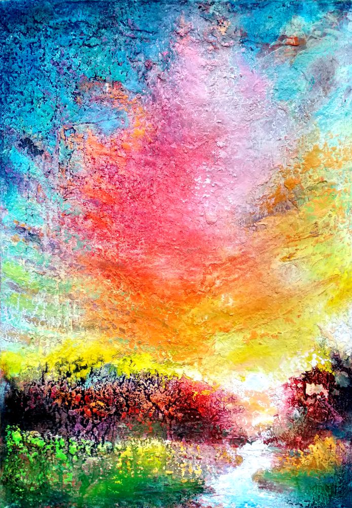 Obraz oczarowuje feerią barw, które wylewają się na płótno niczym wybuch emocji. Góra jest skąpana w głębokim błękicie, przechodzącym w turkusowe odcienie. W centrum dostrzegalny jest wir różu i pomarańczu, jakby niebo płonęło pod dotykiem słońca. Dolna część płótna ukazuje intensywnie zielone i bordowe plamy przypominające gęsty las, tworzący harmonijną ziemią linię. Wow, ale kolory! Atmosfera obrazu wprawia w zachwyt, emanuje ciepłem i spokojem, ale gdzieś też czai się nuta tajemnicy. To jakby senne marzenie, które pragnie się śnić jeszcze chwilę dłużej. Styl dzieła zdaje się być impresjonistyczny, artysta zrezygnował z realistycznych szczegółów na rzecz capture momentu pełnego życia i energii. Technika zastosowana w obrazie daje wrażenie ruchu, a grube pociągnięcia pędzla dodają dynamiki. Patrząc na to, można poczuć ekscytację, jakbyśmy właśnie odkryli skrawek raju. Interpretacje mogą być różne, ale na pewno ktoś dostrzeże nadzieję w tej eksplozji barw. A personalnie, czuję lekkość i radość, jakby ktoś obiecał, że wszystko będzie dobrze. Wreszcie, amazing - to słowo pasuje idealnie.