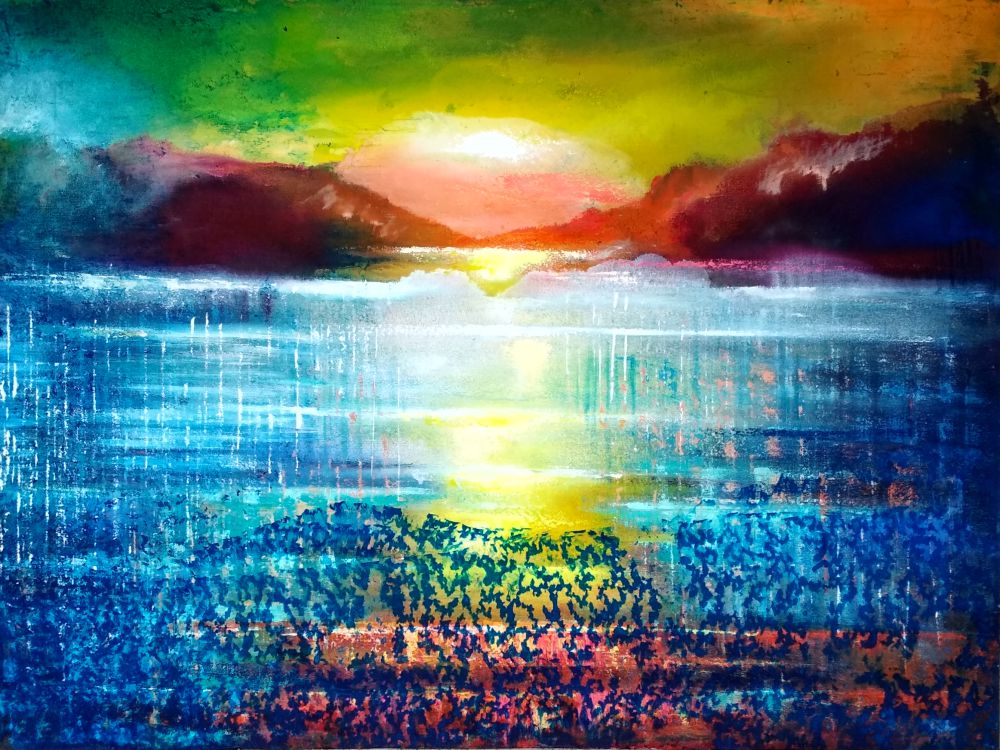 Obraz wybucha kolorami jak fajerwerki na niebie. Dominują odcienie niebieskiego i zielonego, ale najważniejszy akcent to ciepłe, promieniujące słońce na horyzoncie. Zachód słońca wygląda jakby życie mogło się tam zatrzymać. Przejścia między kolorami są płynne, jakby delikatnie zmieszane pędzlem. Nastrój? Spokojny, z nutką nostalgii. Styl artysty to chyba coś z pogranicza impresjonizmu i abstrakcji. Technika wygląda na akwarelę rozmarzoną z odrobiną chaosu. Patrząc na to dzieło, można poczuć, jak serce robi się lżejsze. Jakbyśmy byli nad brzegiem jeziora, gdzie woda lekko falowała, odbijając świetlistą poświatę. To miejsce, gdzie czas płynie wolniej. Obraz ma w sobie jakąś magiczną tajemnicę, co sprawia, że chcesz tam być, zanurzyć się w "dreamlike" krajobrazie. Wyobraźnia aż krzyczy, chce wołać coś w stylu: "Mamo, ja tam pójdę i zrobię zamek z piasku!". To obraz, który trzyma cię na krawędzi rzeczywistości i marzenia. Sprawia, że chcesz więcej takich chwil. Ah, jakie to cudowne uczucie.