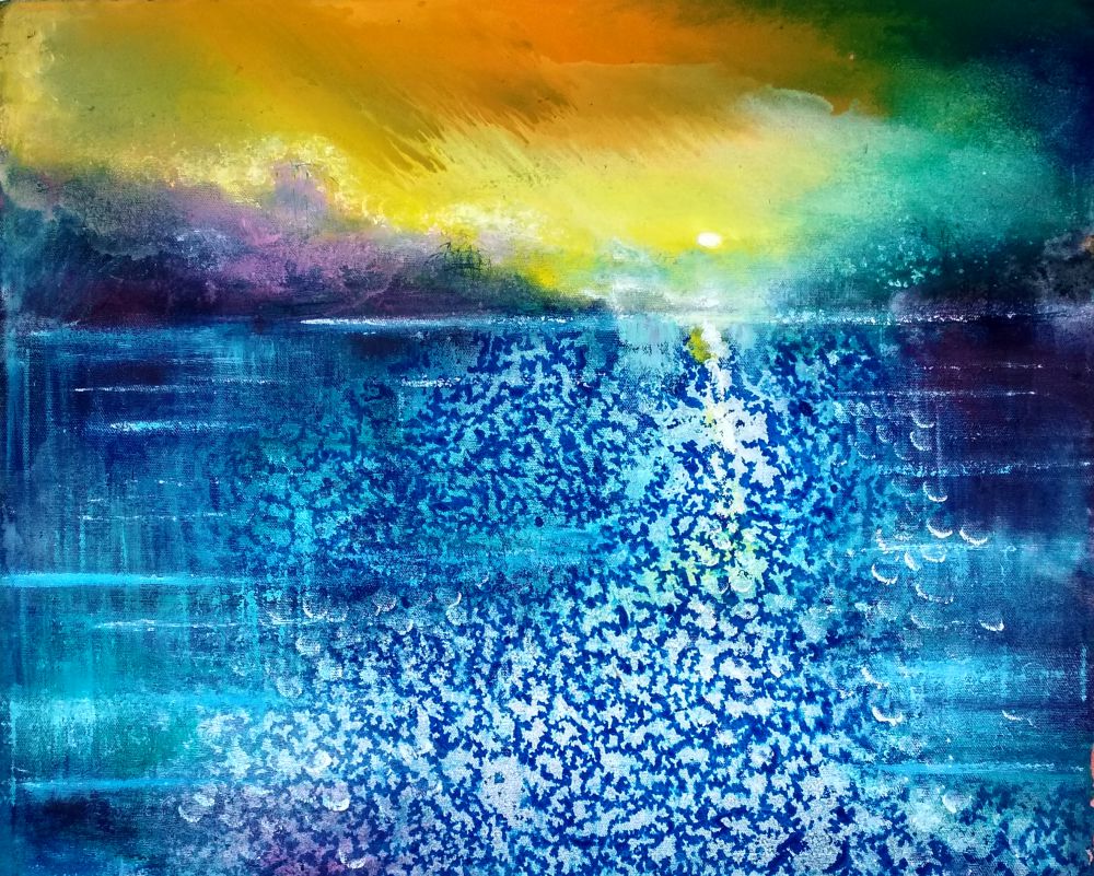 Ten obraz to prawdziwa uczta dla oczu, pełna eksplozji kolorów i tajemniczej głębi. Dominują tu intensywne odcienie błękitu, które przywodzą na myśl spokojną, choć nieco wzburzoną powierzchnię oceanu. Góra obrazu zanurza się w ciepłych pomarańczach i żółciach, przypominających zachodzące słońce, które niebo płonie na horyzoncie. A te maleńkie wzorki na dole, wyglądające jak rozsypane konfetti, dodają lekkości całej kompozycji. Atmosfera obrazu jest nieco oniryczna, jakbyś patrzył na sen, który ledwie pamiętasz. To takie "dreamy" uczucie, kiedy nie do końca wiesz, co jest realne, a co nie. Styl malarza jest ewidentnie abstrakcyjny, z techniką mieszaną, swobodnym nakładaniem farby, może nawet przy użyciu szpachli lub gąbki. Wyobrażam sobie, że artysta czuł wolność, kreując to dzieło. Obraz może wywołać różne emocje. Dla mnie jest uspokajający, ale też pobudzający do refleksji o nieskończoności i pięknie natury. Dla dziecka mógłby to być świat z bajki, kraina, gdzie wszystko jest możliwe. Jest coś poruszającego w tej niesfornej harmonii barw i kształtów, jakby każdy element mówił "patrz, jestem tu". Patrząc na to, czuję chęć ucieczki, oddalenia się od codziennych spraw i zagubienia w tej feerii kolorów. To, jakie emocje wywołuje obraz, może być bardzo subiektywne, a urok tej pracy polega na tym, że mówi do nas na różnych poziomach. Podziwiajmy to, co nas inspiruje i zatrzymuje na chwilę w biegu codziennego życia.