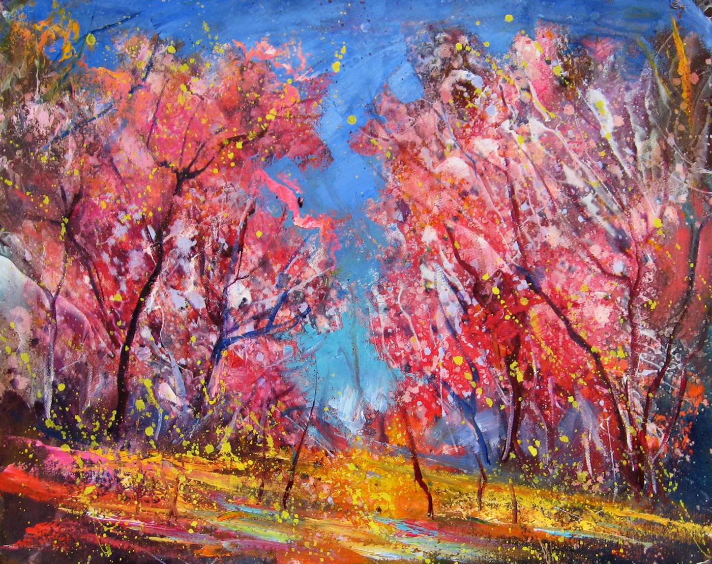 Na obrazie dominują intensywne odcienie różu, czerwieni i niebieskiego, tworząc bajkowy krajobraz. Gałęzie drzew wiją się ku górze, jakby chciały sięgnąć jasnego, bezchmurnego nieba. Kompozycja jest dynamiczna, pełna energii, z eksplozją kolorowych plam, które tańczą przed oczami. Obraz emanuje radosnym nastrojem pełnym optymizmu i świeżości. Łączy w sobie elementy abstrakcjonizmu i impresjonizmu, z widocznymi śladami pędzla i tapnięciami farby, które nadają mu pewną swobodę i lekkość. Gdy na niego patrzę, czuję się, jakbym wkraczał do magicznego lasu, gdzie rzeczywistość miesza się z fantazją. Dzieło może budzić różnorodne emocje. Dla jednych to "magiczna" droga do dzieciństwa, pełna marzeń i kolorów. Inni poczują spokój i ukojenie, jakby od szumu liści można było zaczerpnąć oddech. Czy to nie fascynujące? Każdy detal zdaje się opowiadać swoją historię, pełną ciepła i radości. Czuję, że mogłoby powiedzieć: "Patrz, jak pięknie!" Ten obraz przypomina mi o pięknie natury, o przypływie energii i życia, które czujemy w wiosenny dzień. Jest jak piosenka, niesie dźwięki przyrody i pobudza wyobraźnię, stając się "wonderland" pełnym kolorów i emocji.