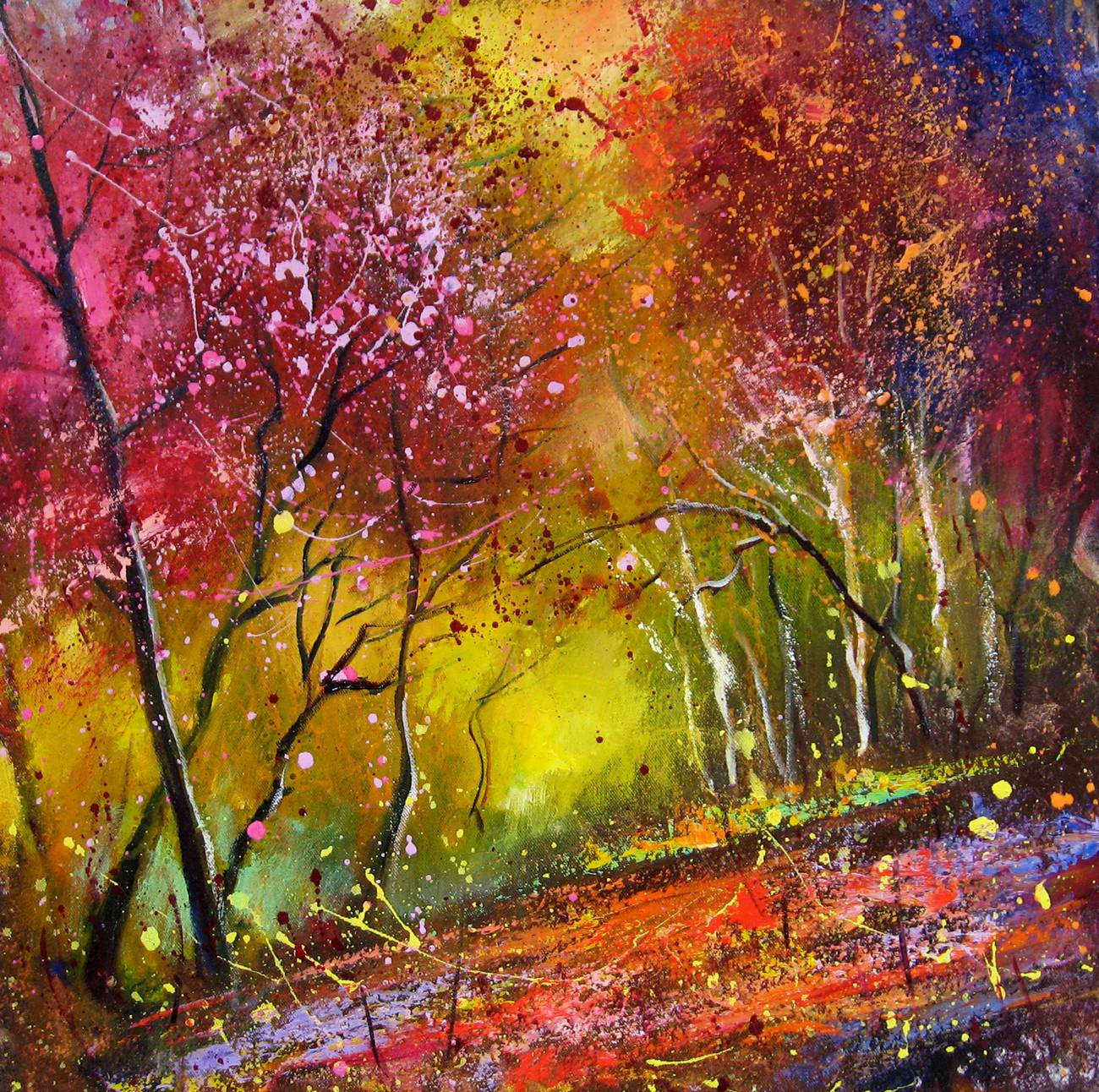 Na tym obrazie, kolorowe szaleństwo! Dominują dynamiczne barwy: czerwienie, pomarańcze i zieloności, jakby płonący las. Drzewa, wierzchołkami sięgające płócien, wiją się jakby w tańcu. Kompozycja pełna energii, chaotyczna a zarazem hipnotyzująca. Atmosfera jest jak jesienna burza, której towarzyszy szmer liści w powietrzu. Artysta postawił na technikę impasto i dripping, przez co obraz zdaje się tętnić życiem. To dzieło, które wręcz krzyczy radością, chociaż niektórzy mogą poczuć nutę nostalgii. "Ze smakiem chaosu", jakby łamie zasady, ale w taki sposób, że nie można oderwać od niego wzroku. Czuję, że chcę tam wejść, poczuć wiatr i dotknąć kory drzew. Mały widz stwierdziłby po prostu: "Wow, ile kolorów!" Obraz pobudza wyobraźnię, budząc wiele emocji. Is it a dream czy rzeczywistość? To pytanie zadaje sobie każdy, kto patrzy na to dzieło. Takie obrazy zostają na długo w pamięci, zostawiając ślad w głowie i w sercu.