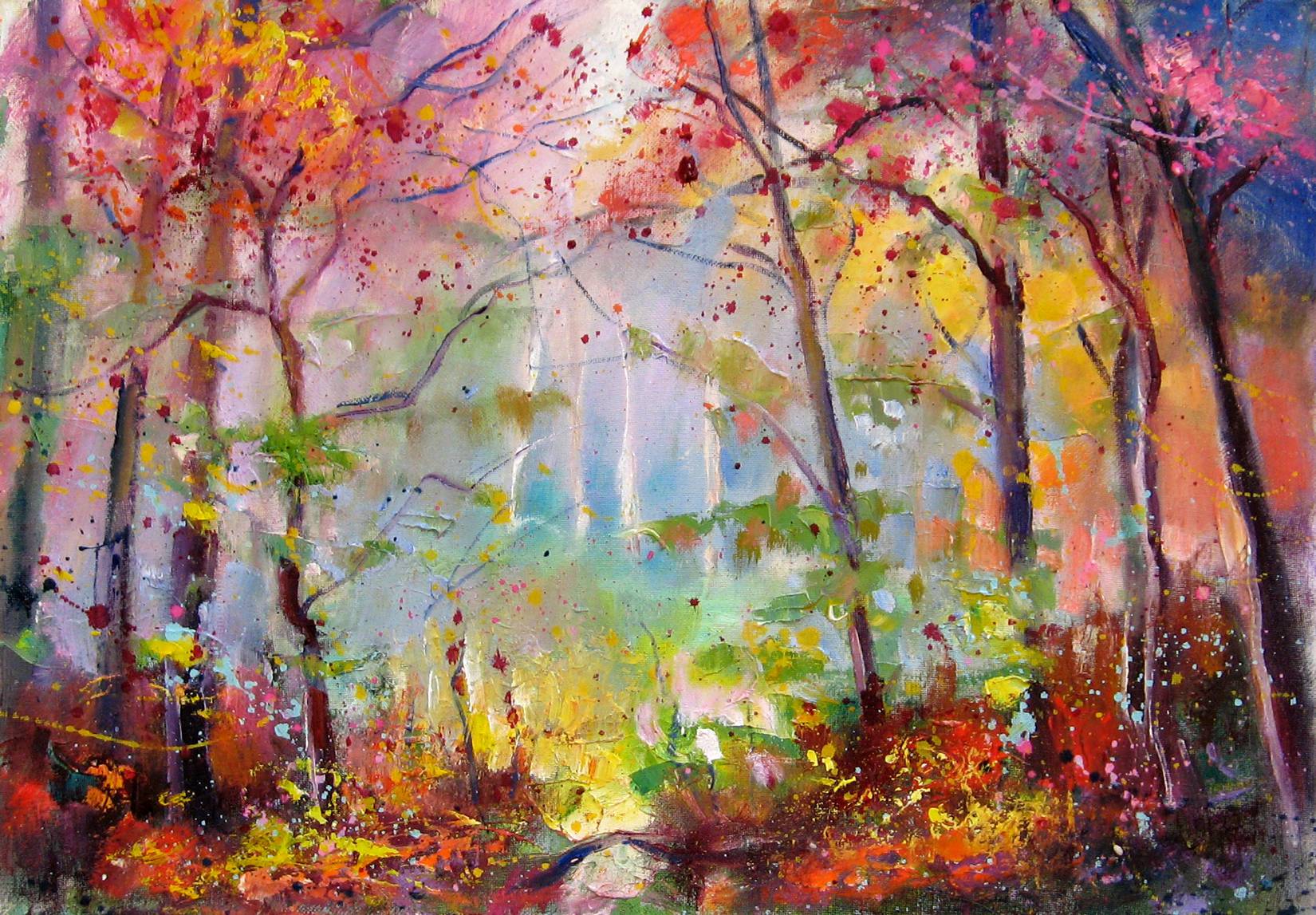 Na obrazie widzimy malowniczy jesienny krajobraz. Dominuje on feerią kolorów: soczyste żółcie, głębokie pomarańcze i intensywne czerwienie mieszają się z delikatnymi różami i błękitami. Drzewa o zawiłych gałęziach tworzą rytmiczną kompozycję, a tło zdaje się pulsować różnorodnymi odcieniami, jakby artysta chciał pokazać całą magię tej pory roku. Atmosfera jest pełna spokoju, a jednocześnie tętni życiem, tak jakby obraz przenosił nas na stronę magicznego lasu prosto z bajki. Ten artwork, jak to mawiają, to prawdziwy majstersztyk. Technika malarska sprawia wrażenie niedbałej, lecz z precyzyjnie dobranymi detalami i kolorami. Każda kropka farby wydaje się być umieszczona z miłością i zrozumieniem natury. Emocje? To czysta radość. Obcowanie z tym obrazem jest jak wizyta w krainie marzeń, gdzie wszystko jest możliwe. Patrząc na ten obraz, dziecko mogłoby powiedzieć: "Wygląda jak zaczarowany las z mojej książki." Osobiście czuję się zainspirowany. Gdy patrzę na tę kompozycję, czuję przypływ energii i nieodpartą chęć zanurzenia się w podobnym krajobrazie w rzeczywistości. Czy to magia? Może trochę.