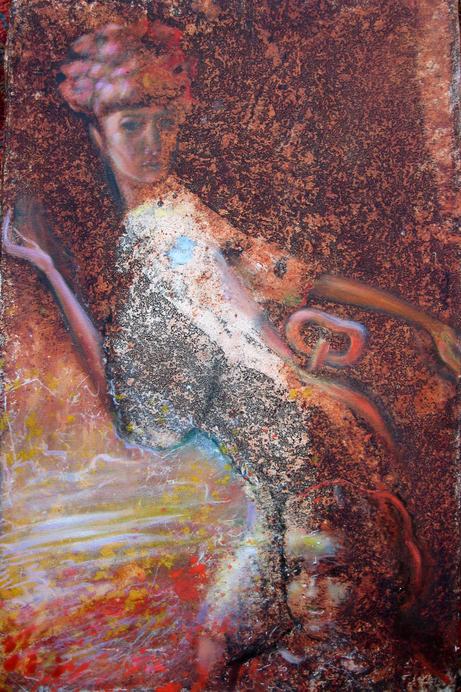 Obraz przedstawia intrygującą scenę utrzymaną w ciepłych, rdzawego odcieniach, które dominują nad całą kompozycją. Wyłaniająca się postać kobiety zdaje się niemal stapiać z otoczeniem. Jej delikatne ruchy i subtelne, nieco rozmyte rysy twarzy dają poczucie tajemniczości i ulotności. Kolorystyka przypomina jesienny zmierzch, pełen głębokich brązów i czerwieni, które dodają dziełu intymnego charakteru. Artysta zastosował technikę mieszania farb, co tworzy fakturę i wrażenie dynamiki. Atmosfera jest nieco melancholijna, ale jednocześnie pełna enigmy. To jak sen, z którego nie chcesz się obudzić. Facet, który to namalował, naprawdę wiedział, co robi. I tak sobie myślę, że może to być wizja wewnętrznej siły lub przemijającej chwały. Ale to tylko moje odczucia. Narysowałbym taką ładną panią, jakbym umiał. Emocje buzują na granicy rzeczywistości i mistyki, co sprawia, że odbiorca przenosi się w świat nieznany, ale dziwnie znajomy. To taki obraz, który chcesz oglądać w swoim „living room” dzień w dzień.