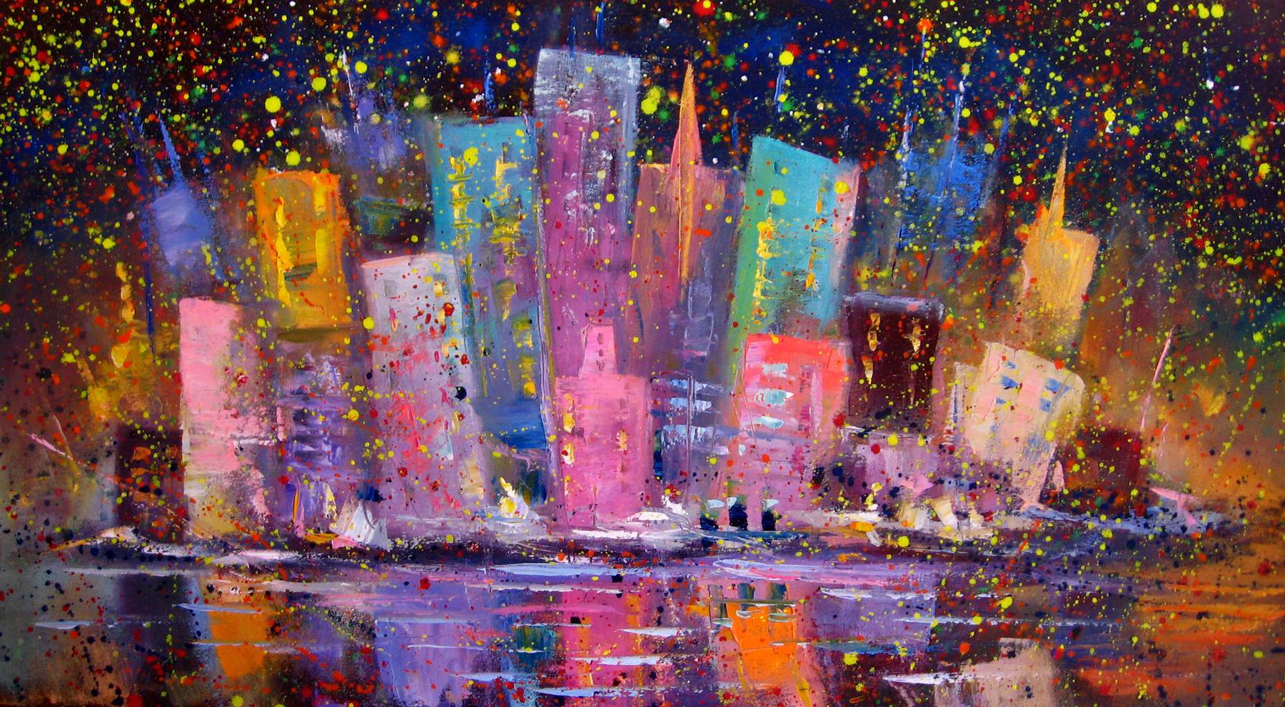 Obraz przedstawia tętniące życiem miasto, osadzone w palecie intensywnych barw. Dominują tu fiolet, róż i błękit, przełamane plamami żółci i czerwieni. Wieżowce zdają się tańczyć na tle nocnego nieba, pełnego barwnych plamek, jakby wszechświat postanowił zagrać w grę w farby. Kompozycja jest dynamiczna, niemalże chaotyczna, co dodaje jej spontaniczności. Malarska technika, to pewnie impast z nutą action painting, bo farby są nałożone grubymi warstwami, a krople wyglądają jak rozpryski. To wszystko tworzy atmosferę radosnego zamieszania i energii. Patrząc na ten obraz, można poczuć ekscytację - jakby samo życie miasta kipiało na płótnie. Dla mnie to przypomina uczucie, które pojawia się, gdy patrzę na rozświetlone miasto z góry. Wow! To takie kolorowe jak tort urodzinowy! Obraz może wywoływać wspomnienia z nocnych spacerów po metropolii lub wyobrażenie miejsca, gdzie wszystko jest możliwe. It's magical. Cieszy oko i inspiruje do marzeń.