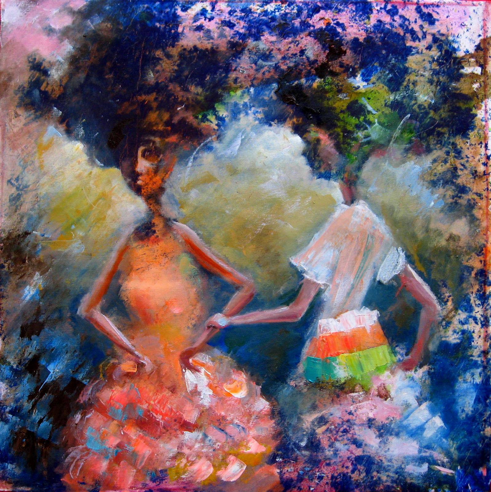 Obraz tętni życiem dzięki harmonii żywych kolorów i dynamicznej kompozycji. Na pierwszym planie widzimy dwie postacie ubrane w barwne stroje, które przypominają kwieciste sukienki. Postać po lewej stronie zdaje się tańczyć w delikatnym świetle mienićących się pomarańczowych i różowych tonów. Po prawej, jej towarzyszka prezentuje odważny kontrast białej bluzki i wielokolorowej spódnicy o fakturze niemalże abstrakcyjnej. Wszystko to otoczone jest błękitno-burą mgłą, która sprawia wrażenie tajemniczości. Wow, mówiłby siedemioletni maluch, widząc tyle kolorów! Atmosfera jest prawdziwie magiczna, jakbyśmy obserwowali scenę z innego, baśniowego wymiaru. Artysta zastosował malarstwo impasto, tworząc grubą warstwę farby, gdzie każdy pędzelkowy ruch opowiada swoją unikalną historię. Styl obrazu jest bardzo ekspresjonistyczny, emanujący emocjami i energią. Kiedy patrzę na to dzieło, czuję przypływ radości i swobody, jakby obraz szeptał „freedom”. Artystyczne techniki użyte w tym obrazie mogą wywoływać u odbiorcy uczucie nostalgii za dzieciństwem - czasem niewinności i niekończącej się zabawy. To naprawdę taki obraz, który mówi więcej, niż widać na pierwszy rzut oka.