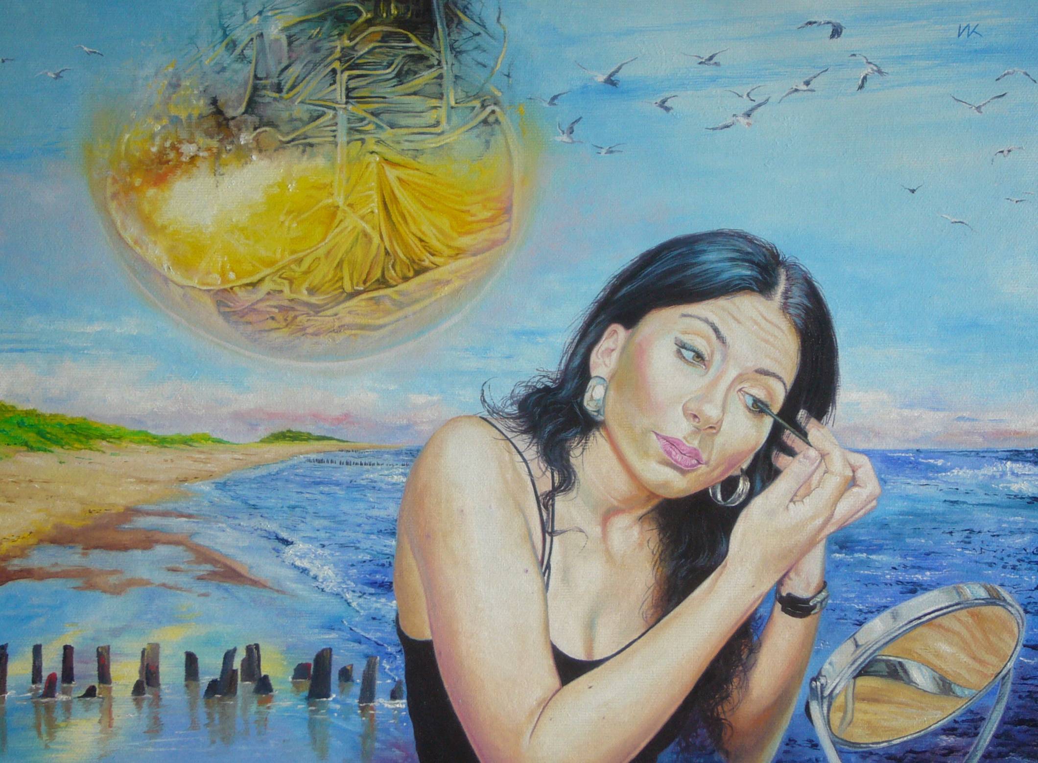 Obraz ukazuje kobietę siedzącą na tle spokojnego morza. Jej ciemne, kręcone włosy kontrastują z błękitem nieba i szumem fal. W centrum kompozycji znajduje się twarz, skupiona na precyzyjnym ruchu pędzelka, co nadaje scenie intymności i spokoju. W tle unoszą się niemalże surrealistyczne elementy – ptaki szykujące się do lotu i dziwna struktura w okrągłym obiekcie przypominającym kulę. A little mystery. Atmosfera jest zarazem sielankowa i zaskakująca, co budzi skojarzenia z marzeniami na jawie. Artysta posłużył się techniką malarską o dużej precyzji, realistyczne detale miesza z elementami fantastycznymi, tworząc ciekawą grę kontrastów. Użyte kolory są żywe, dominujące odcienie błękitów i żółci dodają energii, jednocześnie tworząc wyrafinowaną harmonię. Obraz może wywoływać u odbiorcy refleksję nad naturą wewnętrznej koncentracji i ulotnością chwili. Gdy patrzę na ten obraz, czuję się jakbym sama byłam na plaży. Daje to poczucie spokoju, choć nie pozbawione zaskakujących elementów, które powodują, że chce się patrzeć dłużej. Te ptaki to są czarodziejskie, mówiłoby dziecko. Ten mix rzeczywistości i wyobraźni tworzy coś naprawdę engaging.