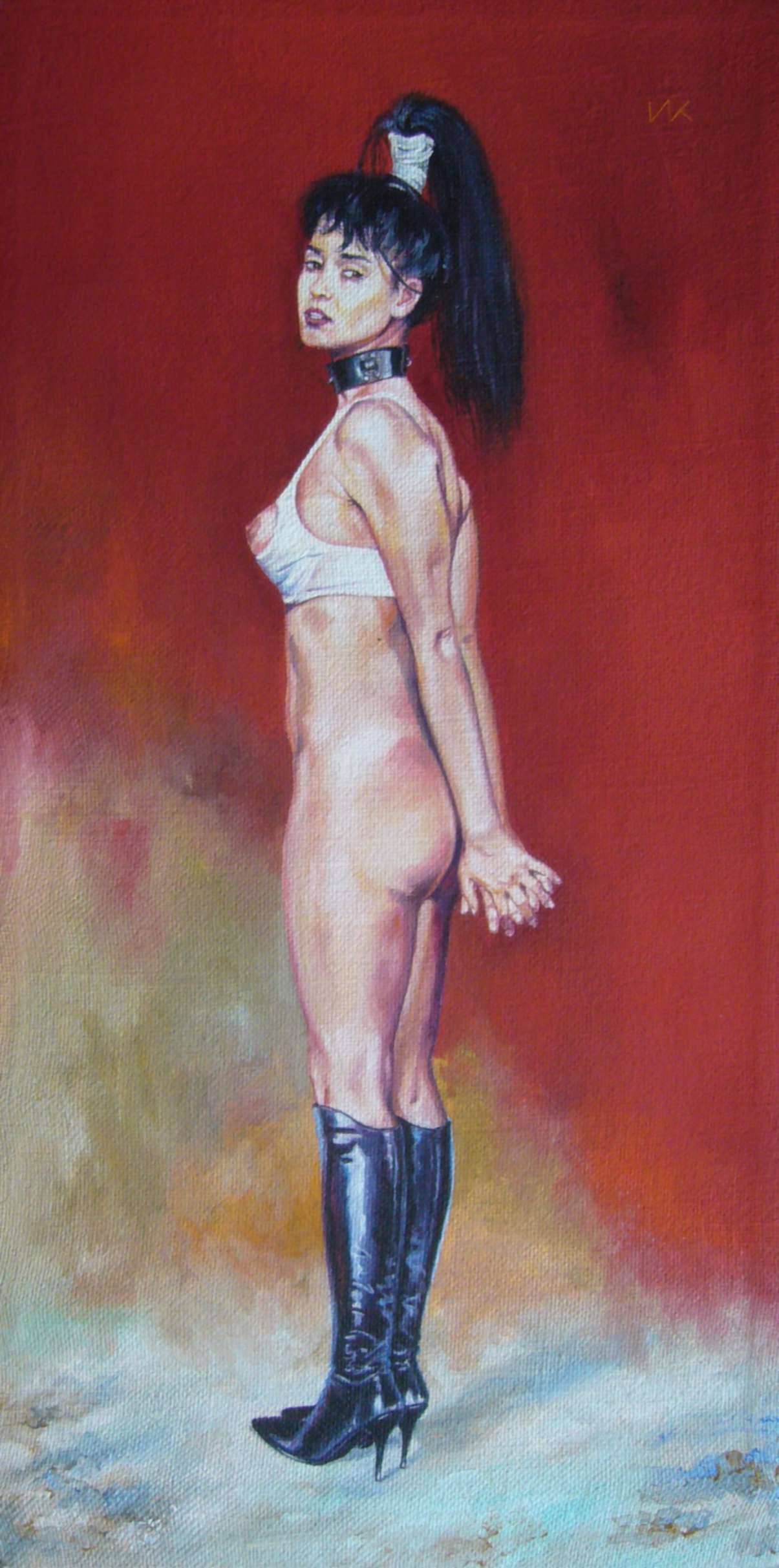 Obraz przedstawia postać kobiety na tle nasyconej, ciepłej czerwieni, co przyciąga wzrok niczym magnes. Te intensywne barwy tworzą kontrast z jasną karnacją i czarnymi, błyszczącymi butami na obcasach. Kobieta stoi bokiem, a jej postawa jest odważna i pewna siebie. Jej ciało jest smukłe, a ciemne włosy zebrane w wysoki kucyk dodają jej charakteru. Mimo prostoty pozy, jest w niej coś intrygującego, może nawet wyzywającego. Kompozycja obrazu jest minimalistyczna, ale to właśnie daje przestrzeń na koncentrację na postaci. Atmosfera obrazu jest intensywna, niemal elektryzująca. Styl artystyczny wydaje się realistyczny, a technika malarska subtelnie operuje światłem i cieniem, co jeszcze bardziej potęguje dynamikę dzieła. Obraz może wywoływać mieszane emocje – od zachwytu po kontemplację nad siłą kobiecości. Dla niektórych może być to "mocny" przekaz (to taki "power"), dla innych subtelna gra kolorów i kształtów. I wiesz co? Mogę sobie wyobrazić, że dziecko powiedziałoby: "Ta pani chyba idzie na bal!" Artysta przez swoją pracę przekazuje pewność siebie, a jednocześnie misterne poczucie estetyki, co pozostawia widza z głębokim uczuciem refleksji.