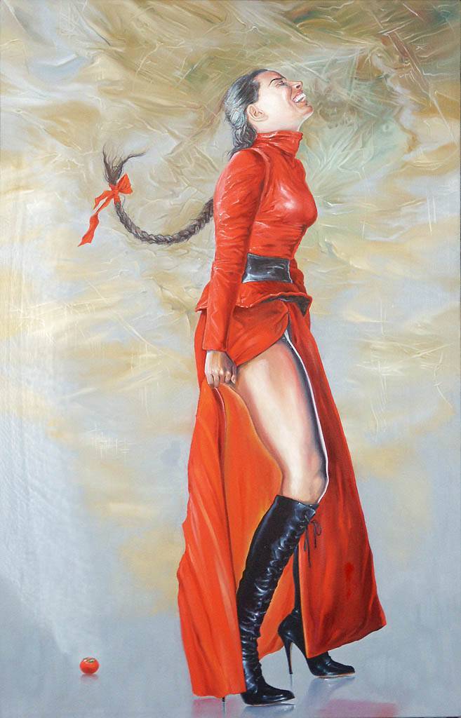 Na przedstawionym obrazie dominują żywe kolory, szczególnie intensywna czerwień sukni bohaterki, która wydaje się niczym płomień tańczącym na wietrze. Jej postać jest dynamiczna, kontrastująca z nieco tajemniczym, mglistym tłem. Strój dodaje jej pewności siebie, a kosa spleciona w fantazyjny warkocz z czerwoną wstążką jest niczym symbol buntu. Artysta używa ostrych konturów do podkreślenia detali, co sprawia, że postać wydaje się niemalże trójwymiarowa. W powietrzu unosi się atmosfera wolności, jakby zaraz miała wzlecieć i dotknąć nieba. Obraz emanuje pozytywną energią i wprowadza widza w pogodny nastrój. Styl malarski jest realistyczny, z delikatną nutą surrealizmu, co sprawia, że obraz może zostać odebrany jako metafora osobistej wolności lub buntu przeciw ograniczeniom. Dla niektórych odbiorców może to być inspirująca wizja, calling do działania. Zastanawiam się, co myślała ta kobieta, może to że życie to przygoda? Wywołuje to we mnie chęć zanurzenia się w ten świat i bycia częścią tej chwili. Pomidor w rogu obrazu, choć niepozorny, dodaje nuty tajemniczości, być może symbolizując coś zupełnie innego niż się wydaje. W sumie, ten obraz to istna bomba emocji i barw. A może po prostu chodzi o radość życia?