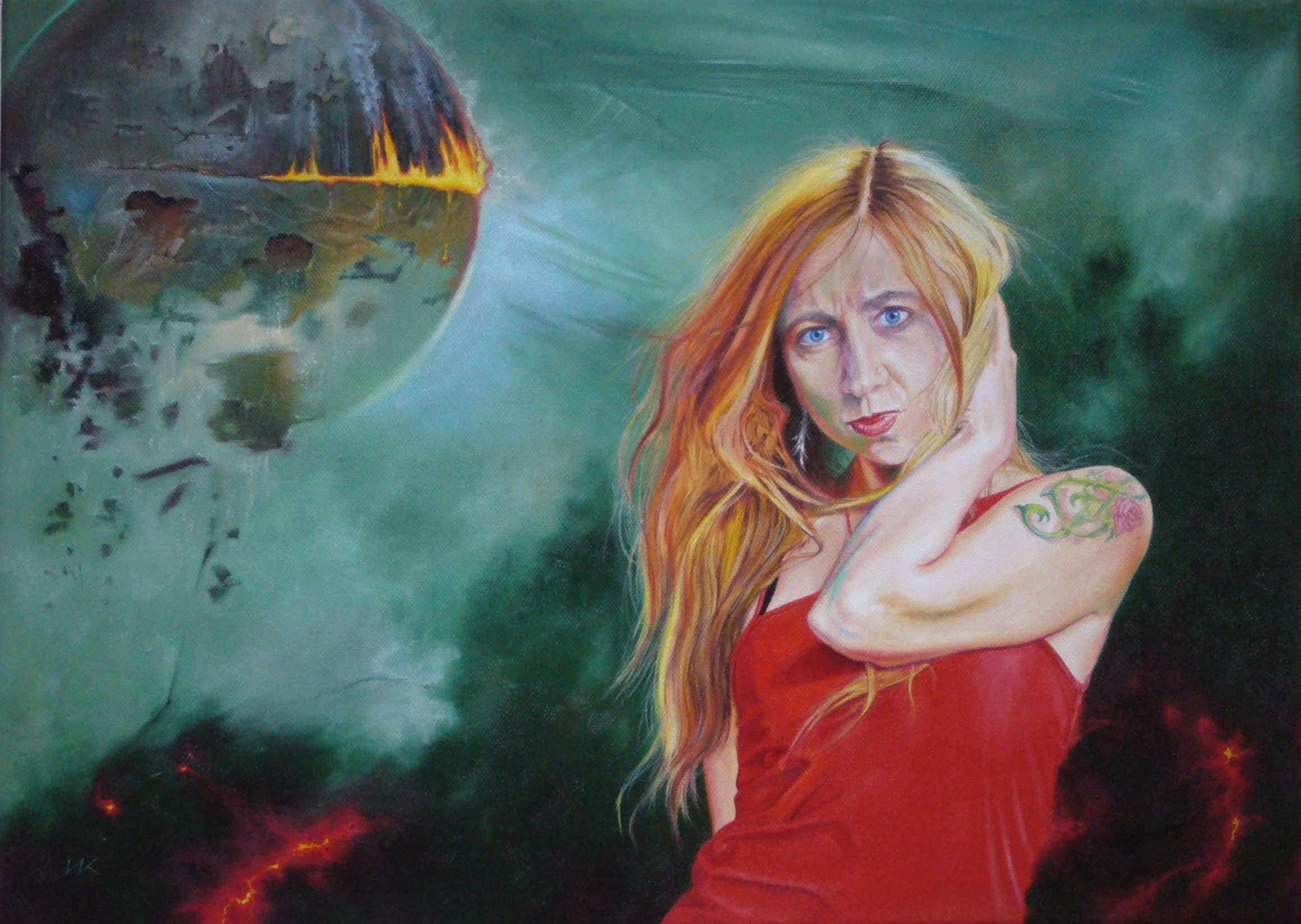 Na obrazie dominują zielenie, które przechodzą w ciemniejsze odcienie, nadając całości tajemniczą aurę. W centrum kobieta z długimi, rudymi włosami, a jej niebieskie oczy błyszczą kontrastując z płomienną kolorystyką. Ma na sobie czerwony strój, a na ramieniu widoczny jest tatuaż. Obok niej coś jakby kula ziemska, która płonie wzdłuż swojego równika. Wygląda to dramatycznie, ale też fascynująco. Artwork moment, który zapiera dech. Nastrój obrazu jest emocjonujący, trochę jakby świat miał się skończyć za chwilę. Styl artystyczny łączy realizm w portrecie z surrealistycznymi elementami otoczenia. Technika jest dopracowana, z dokładnymi szczegółami na twarzy kobiety. Obraz wywołuje poczucie chaosu i niepewności, ale też wewnętrznej siły bohaterki. Patrząc na niego, można poczuć niepokój, może nawet trochę strachu. "Ojej, cały świat płonie" – mogłoby powiedzieć dziecko. Osobiście, czuję się zaintrygowany, jakby artysta zapraszał mnie do refleksji nad kondycją świata. Ten obraz to prawdziwa podróż emocjonalna.